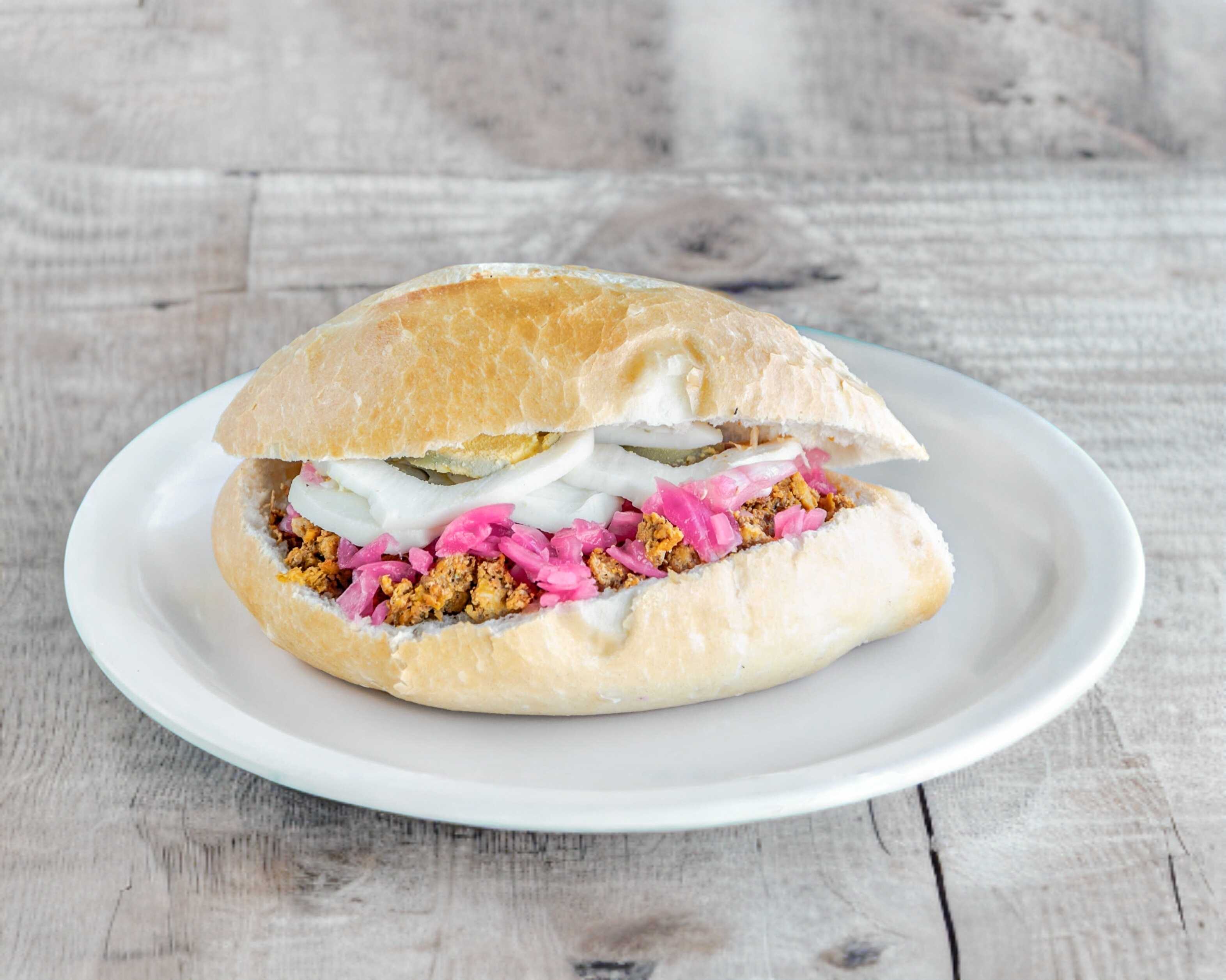 Pan de bolillo con pollo empanizado, cebolla curtida, mayonesa, frijol, romanita y tomate.