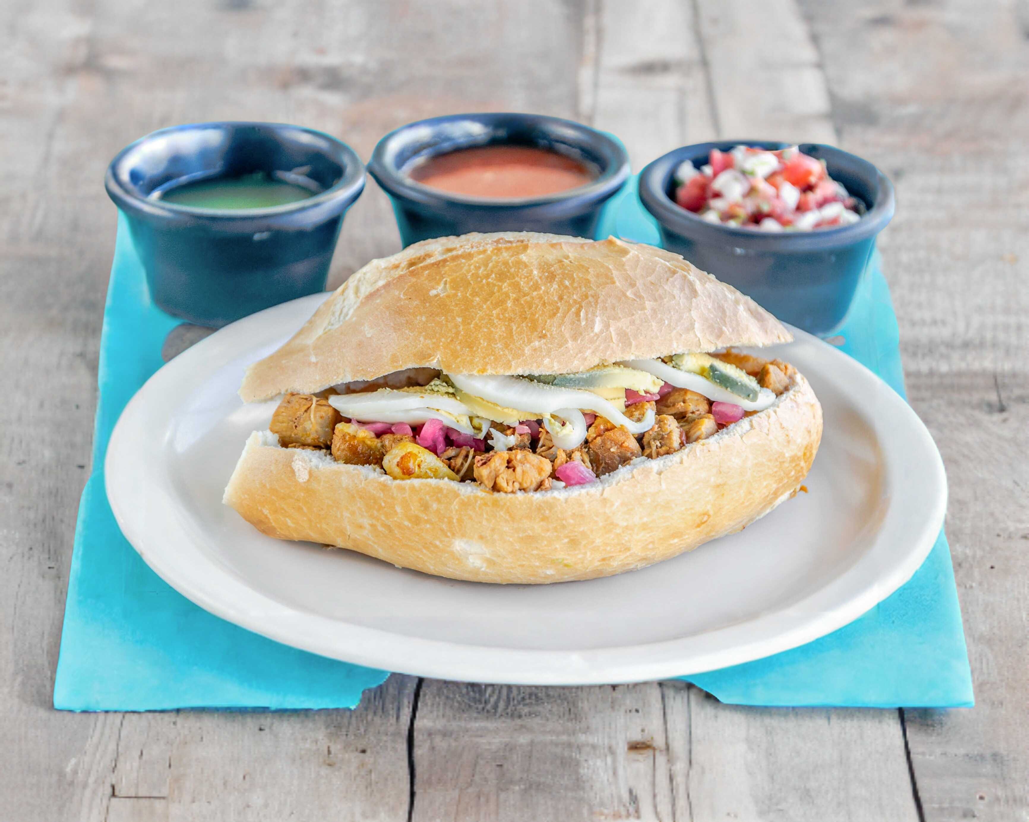Pan de bolillo, Carne de cerdo en lomitios, cebolla curtida y huevo cocido.