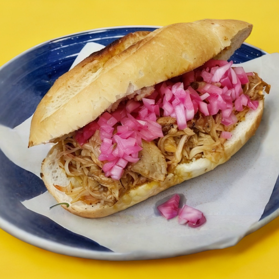 De pan francés, cebolla curtida y salsa de habaneros toreados.