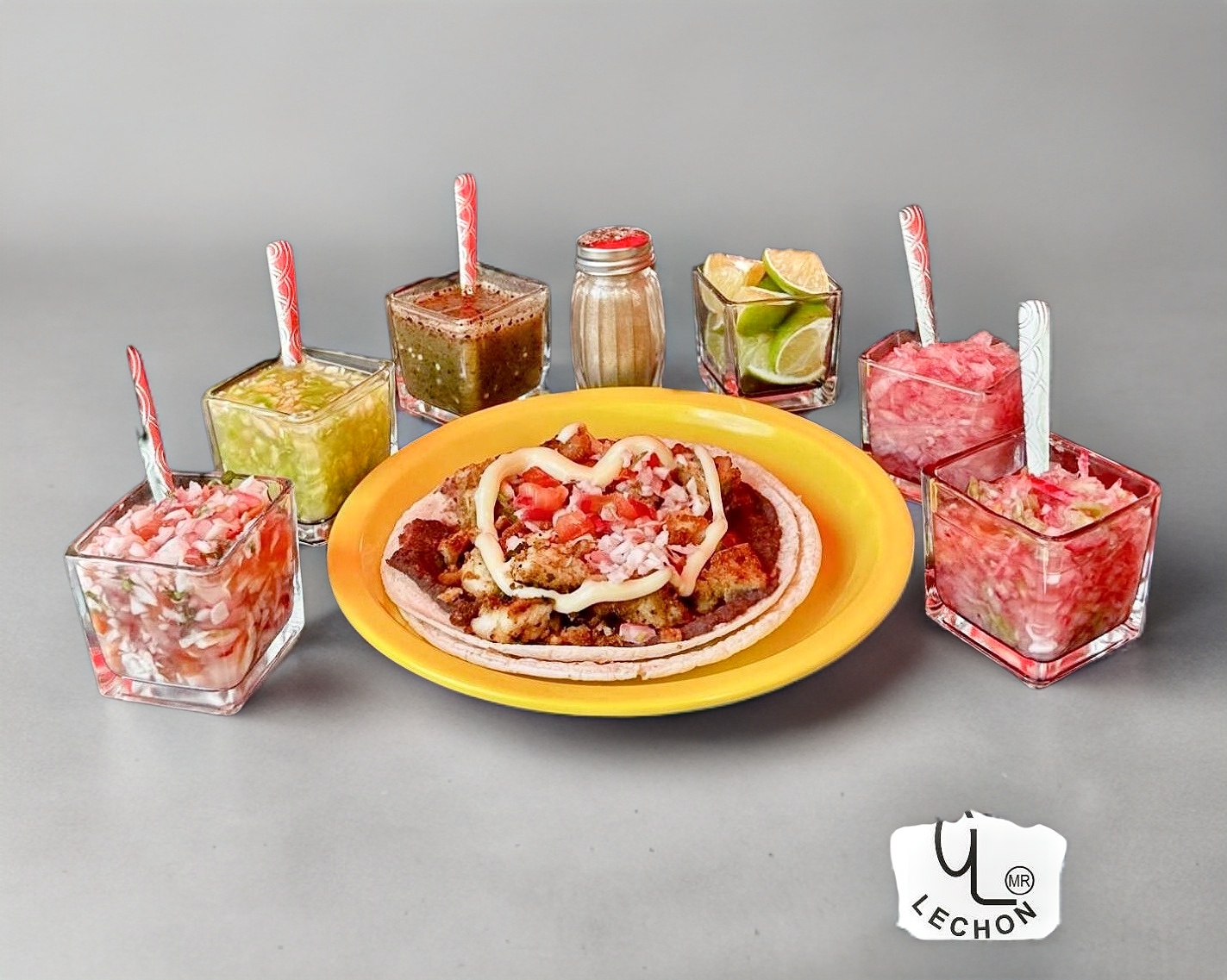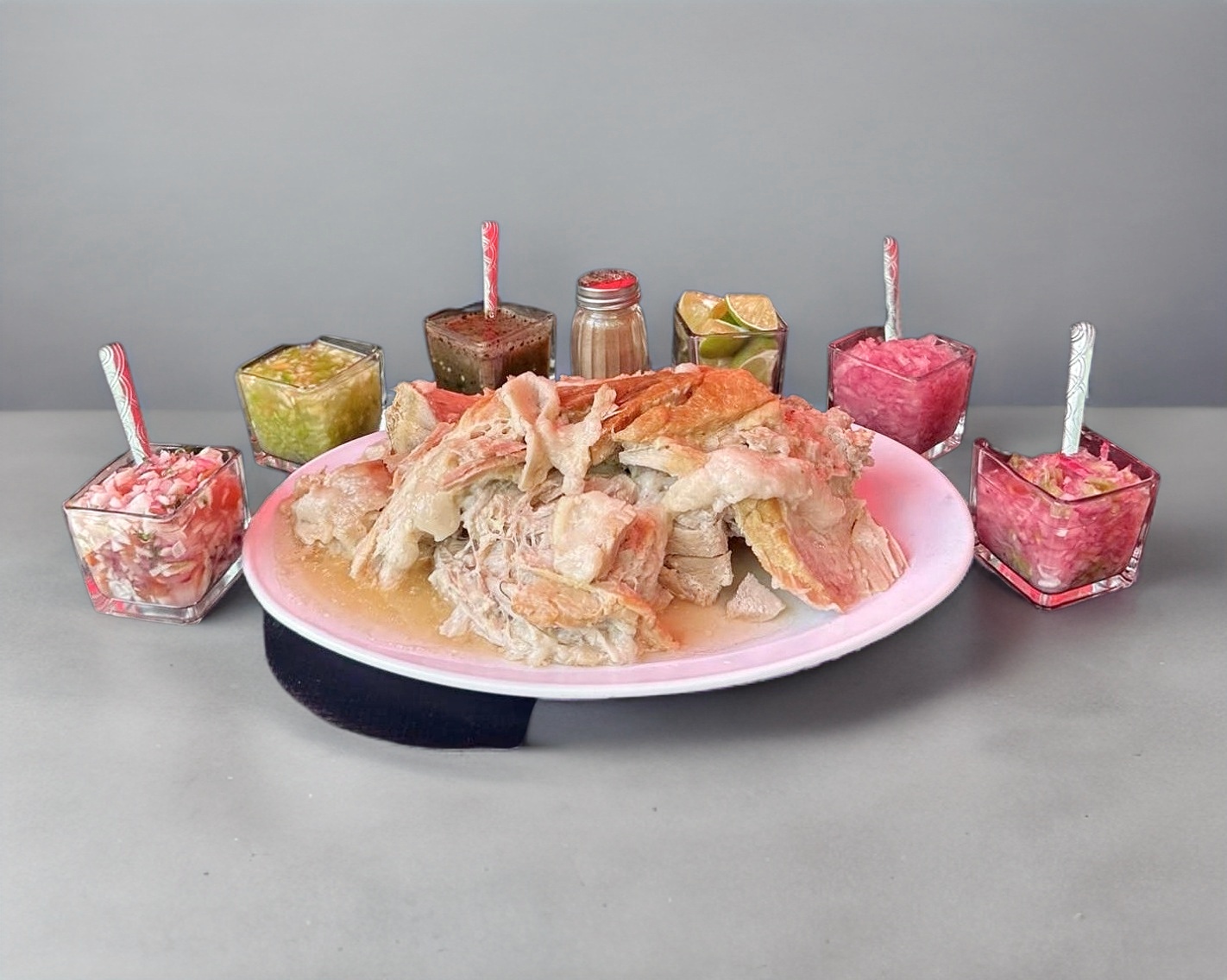 suave y jugoso lechón al horno acompañada de cebolla morada curtida finamente picada, salsa de habanero tatemado, salsa de habanero picado, salsa de cebolla morada con habanero, 150 gr de kilo de tortilla de maíz y por supuesto nuestro tradicional chicharrón horneado.