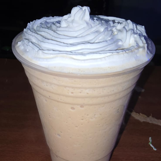 Leche entera, cafe de caramelo, jarabe hershey, chantilly y hielo