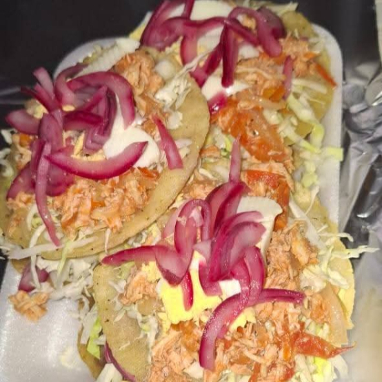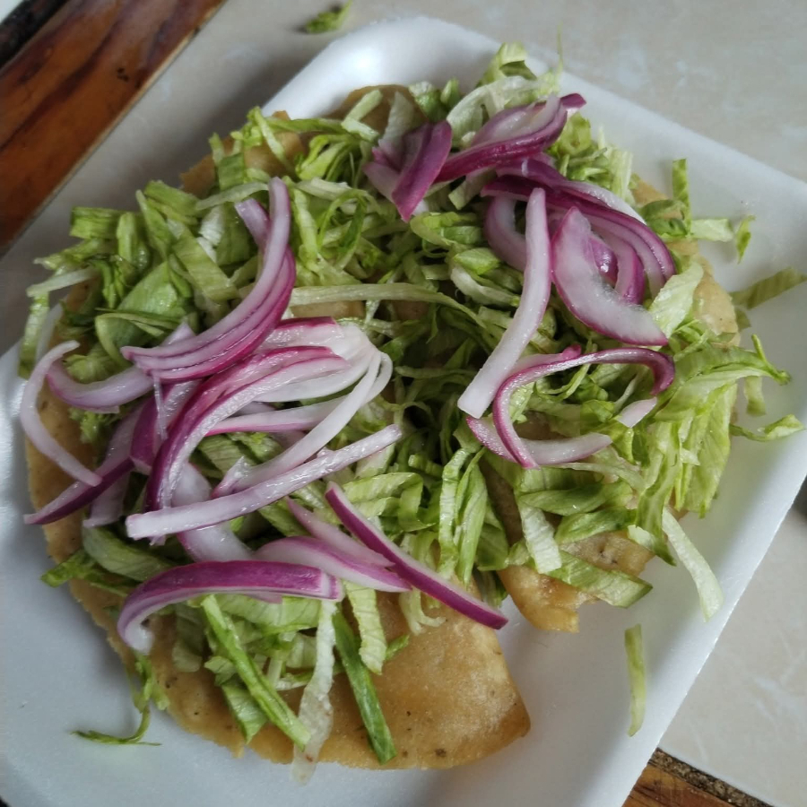 masa, queso aoxaca, lechuga, queso sopero, media crema, salsa de tomate y cebolla morada