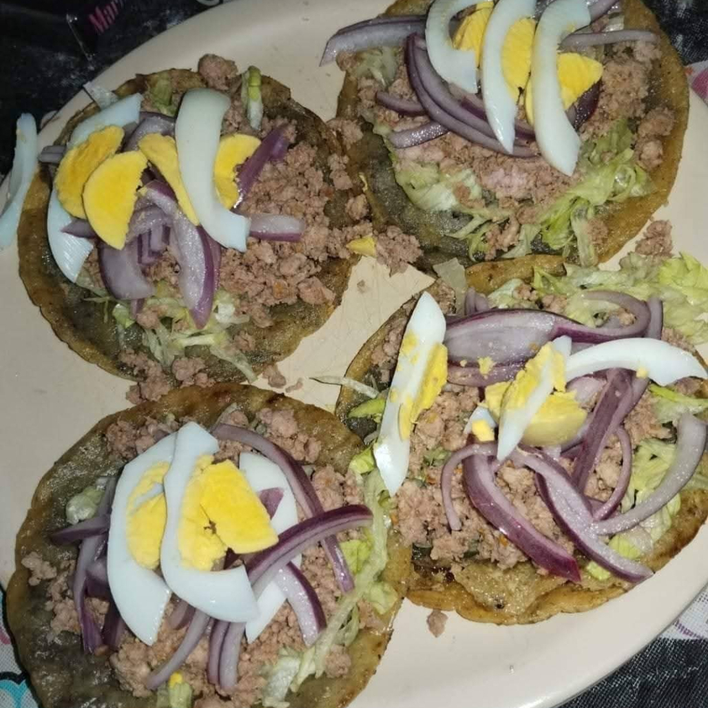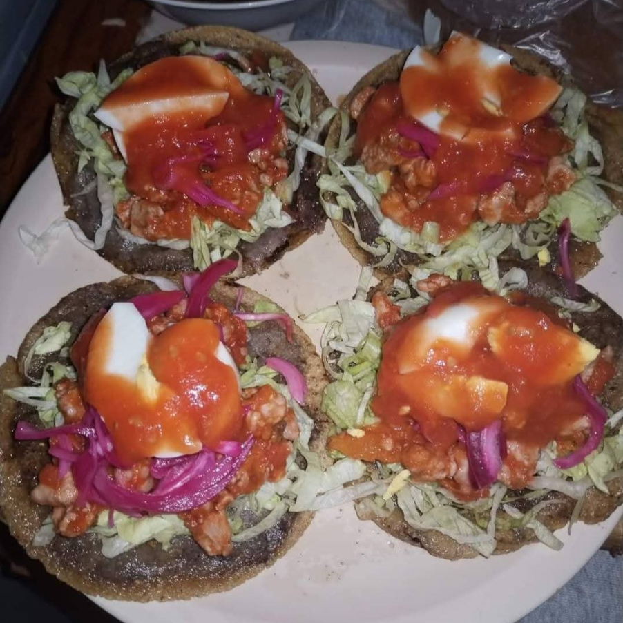 tortilla frita, relleno de frijol con carne molida de cerdo, lechuga, cebolla morada, huevo y salsa de tomate