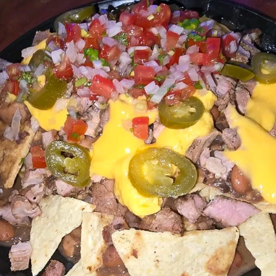 Totopos bañado con frijol, queso cheddar, pico de gallo, jalapeños y carne asada de cerdo