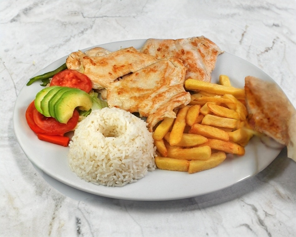pechuga de pollo a plancha , acompañada de ensalada del dia ,arroz, frijoles,tortillas, salsas, 1 botella de agua de temporada.