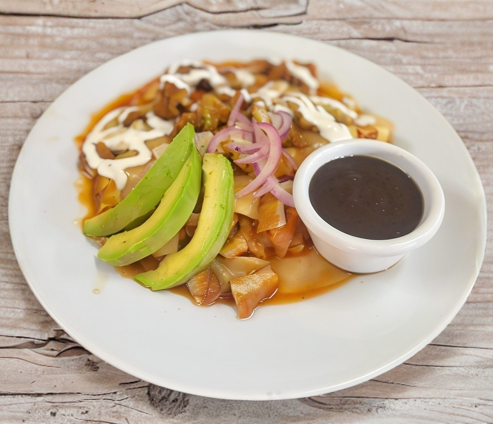 Totopos con frijol, fajitas de res, crema, queso gratinado, lechuga, aguacate, cebolla y tomate, acompañado de salsa picante y agua del día