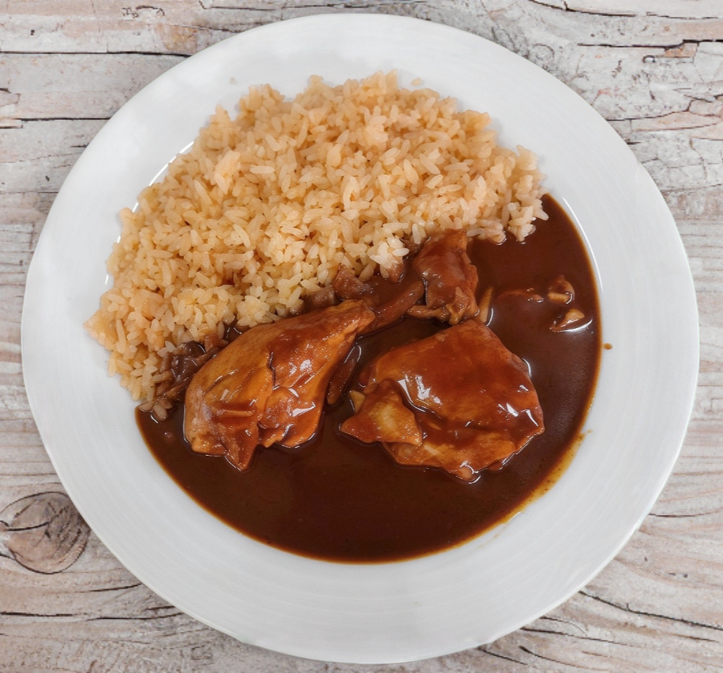 2 Piezas (pierna y muslo) bañado de mole rojo, acompañado de arroz. Incluye tortillas, salsa picante y 1 botella de agua del día