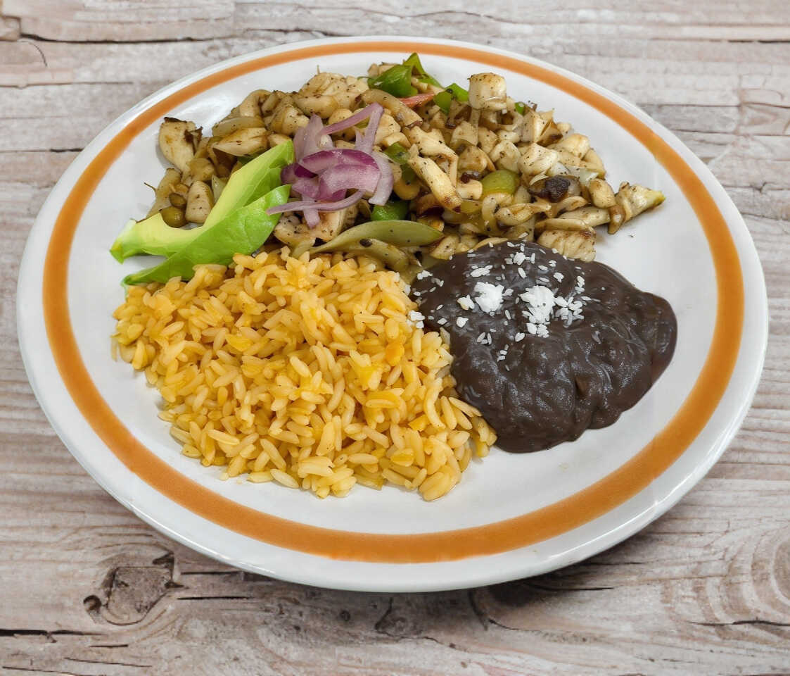 Puntas de pollo con pimiento morrón y cebolla. Acompañado de arroz, frijol, salsa picante, tortillas y agua del día.