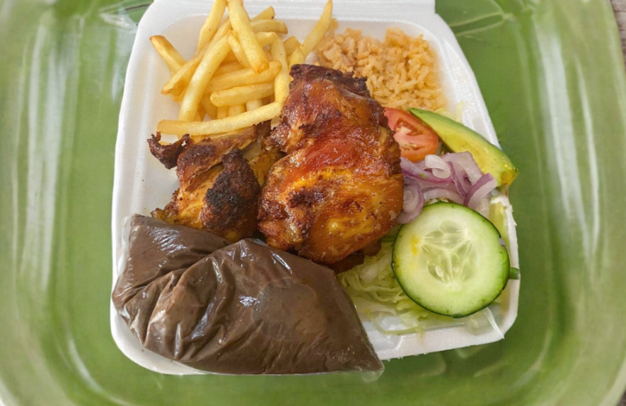 2 piezas de pollo marinado frito, acompañado de frijol, arroz, ensalada y papas a la francesa. Incluye tortillas, salsa picante, catsup y 1 botella de agua del día.