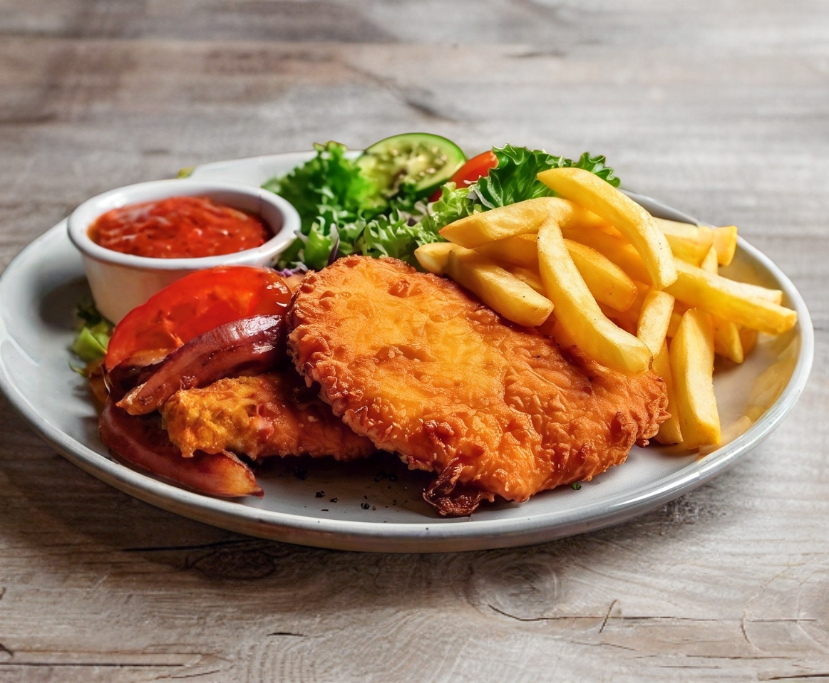 Pechuga de pollo empanizada acompañado de papas fritas, arroz, frijol y ensalada. Incluye salsa picante, salsa catsup, tortillas y 1 coca cola de 600 ml.