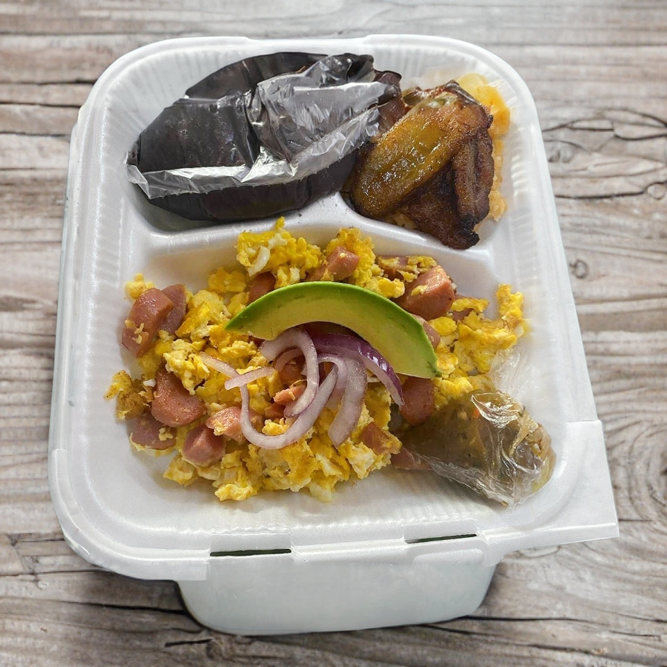 3 huevos revueltos con salchicha, acompañado de arroz, frijol, plátanos fritos, tortillas, salsa picante y agua del día.