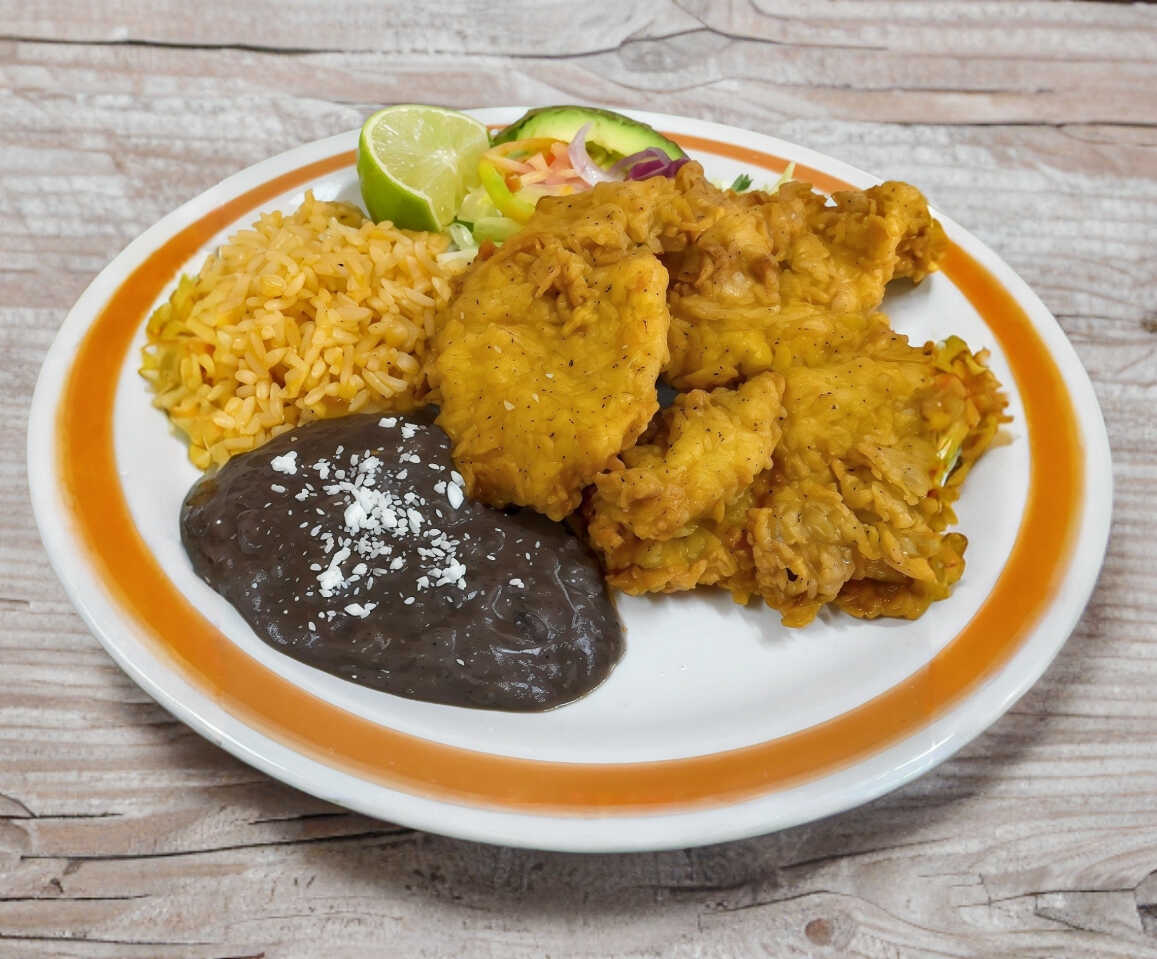 Bisteces fritos de puerco marinados y encebollados, acompañados de arroz, frijol. ensalada, tortillas, salsa picante y 1 agua del día
