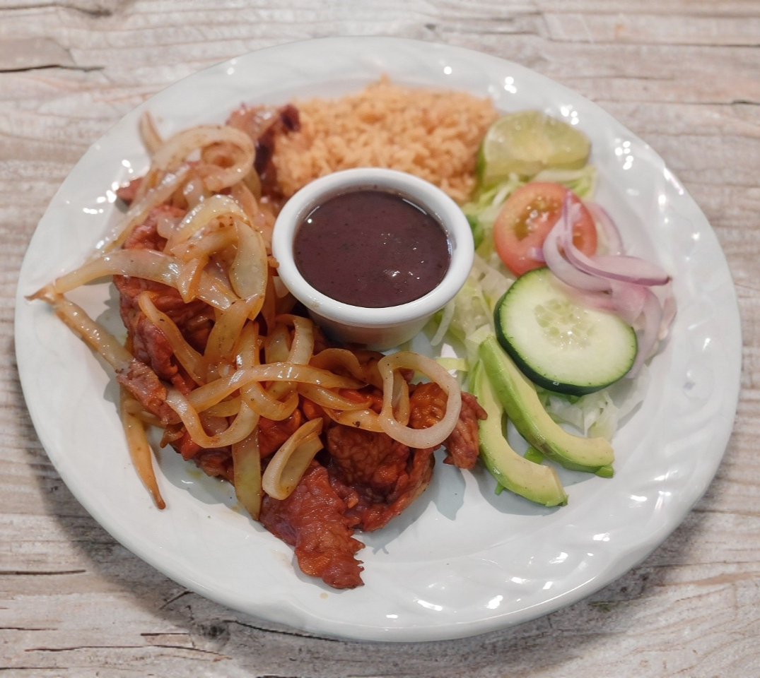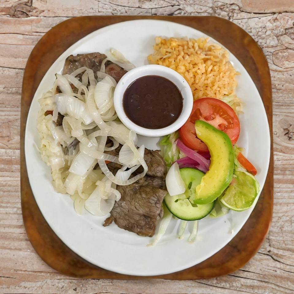Bisteces encebollados de res, acompañados de arroz, frijol, ensalada, salsa picante y tortillas. Incluye 1 botella de agua del día