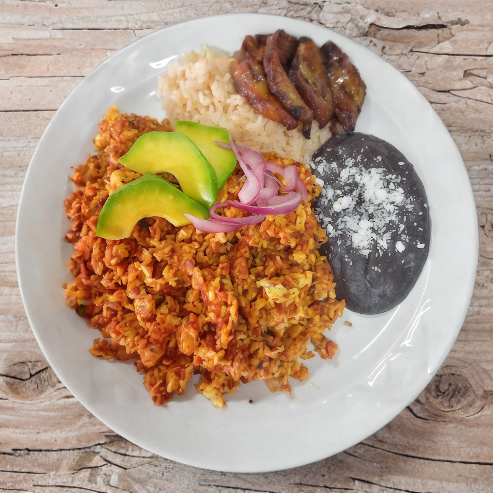 3 huevos revueltos con cebolla, tomate y pimiento morrón. Acompañado de arroz, frijol, plátanos fritos, tortillas, salsa picante y agua del día.