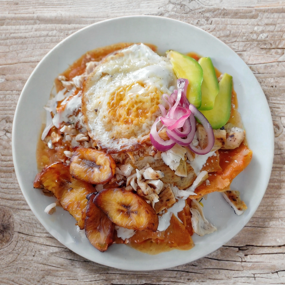 Pollo, huevo estrellado, queso, crema, aguacate y cebolla, acompañado de salsa picante y agua del día