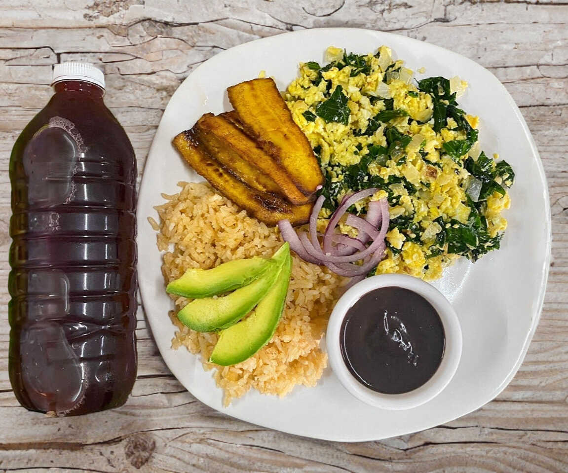 3 piezas de huevo revueltos con cebollita frita y chaya. Acompañado de arroz, frijol, cebolla morada y platanitos fritos. Incluye tortillas, salsa picante y 1 botella de agua del día