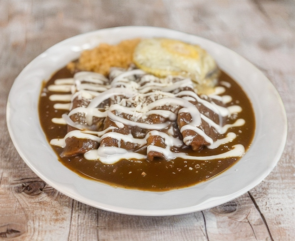 6 tortillas de maíz rellenas de pollo, bañadas en mole, con queso, crema y cebolla. Acompañado de salsa picante y agua del día