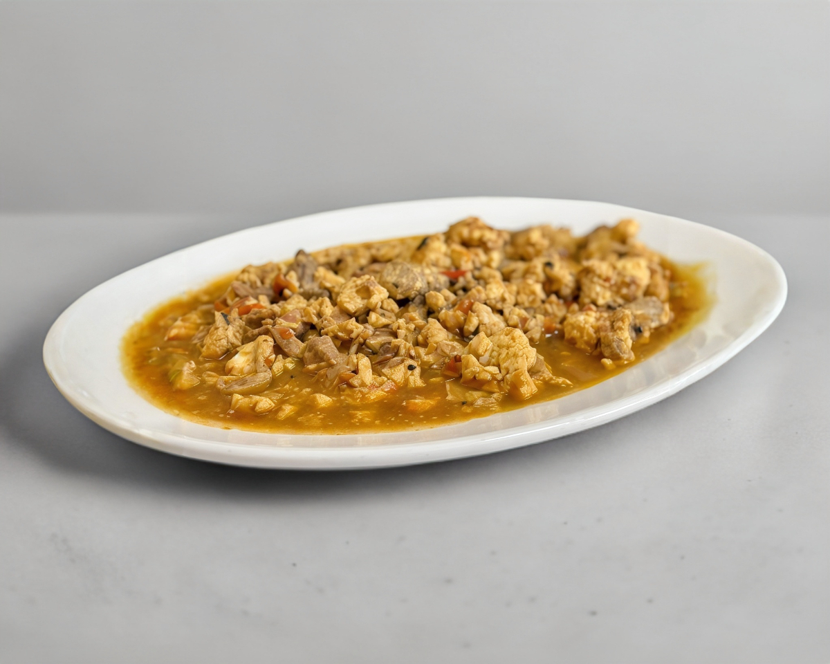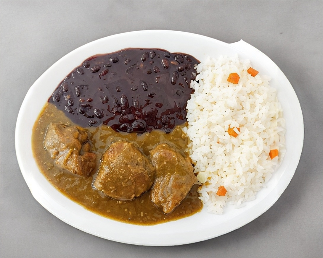carne de cerdo en salsa de jitomate, acompañado con frijoles refritos y arroz. incluye 5 tortillas de maíz hechas a mano.