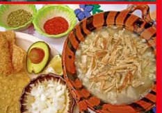 Con carne, chicharrón, aguacate,limón,cebolla, queso, orégano, salsa macha, tostadas,lechuga y rábano.