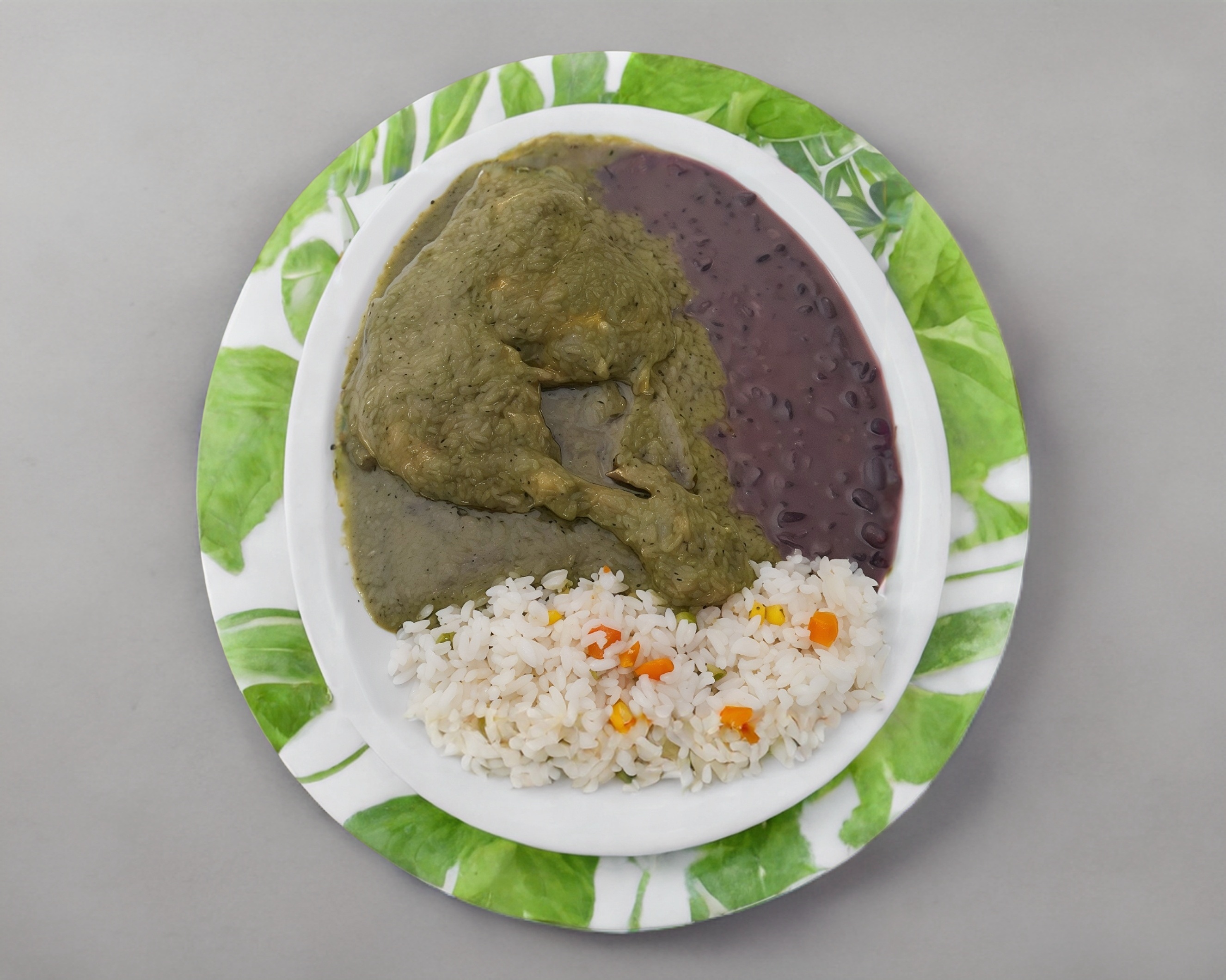 Carne de cerdo en salsa de tomate verde, acompañado con frijoles refritos y arroz. Incluye 5 tortillas de maíz hechas a mano.