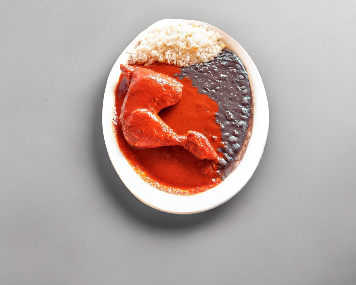 Mole rojo con pierna y muslo. Acompañado de arroz y frijol con 5 tortillas de maíz hechas a mano.