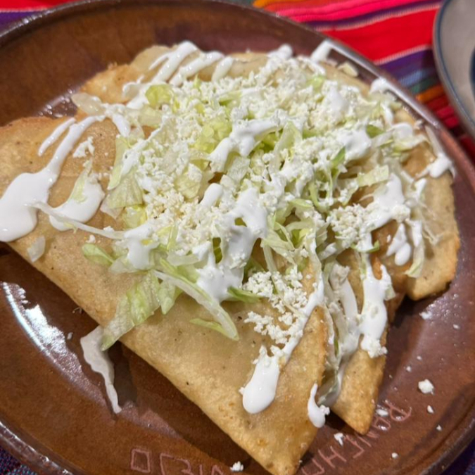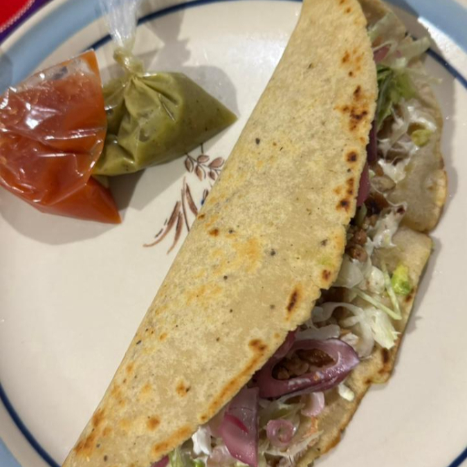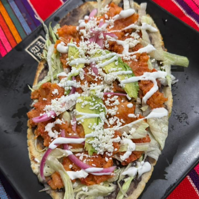 Guiso, frijoles, lechuga, cebolla, aguacate, queso y crema.