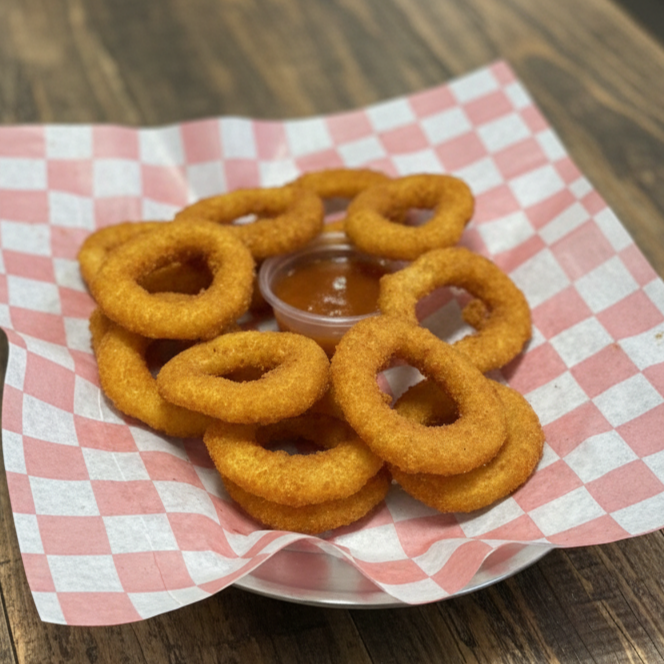 Aros de cebolla capeados y fritos con salsa mango-habanero.