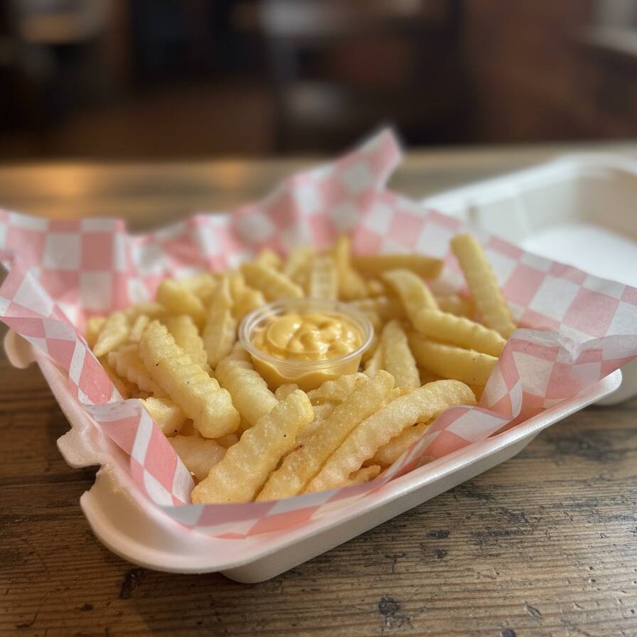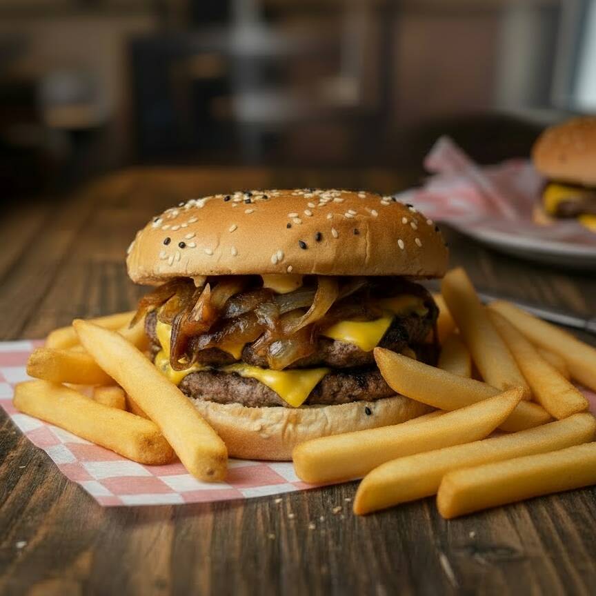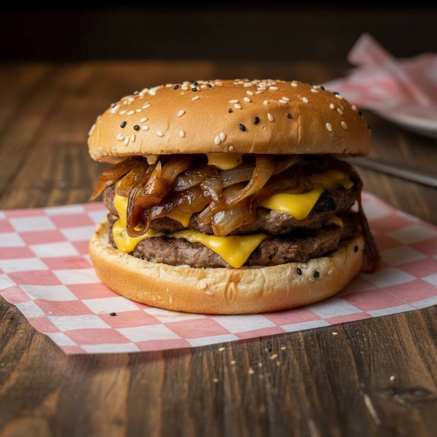 Doble carne de res (250g), queso amarillo, cebolla caramelizada, aderezo de la casa.