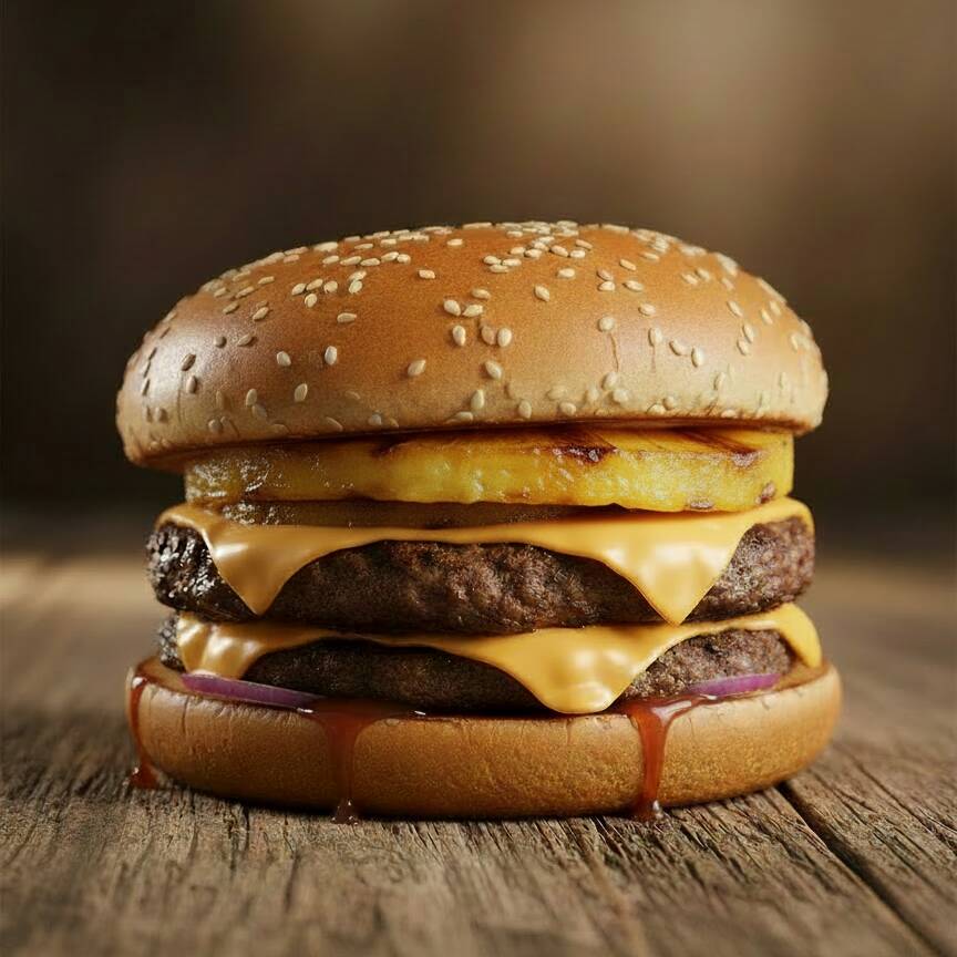 Doble carne de res (250g), piña, salsa BBQ, aderezo de la casa.