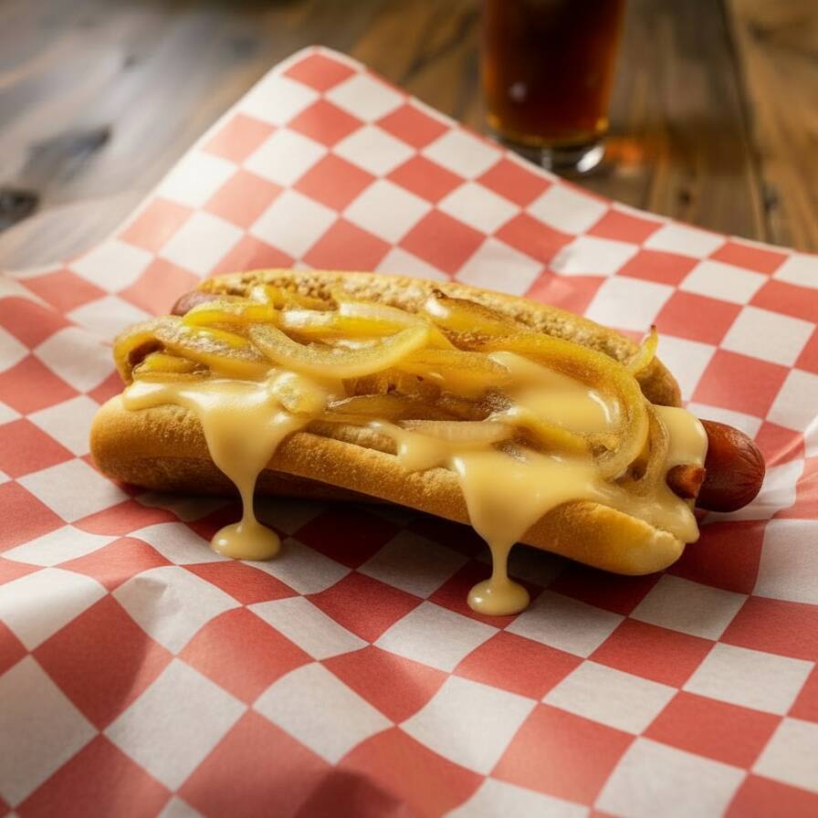 Salchicha de res, con queso derretido, cebolla caramelizada y aderezo de la casa.