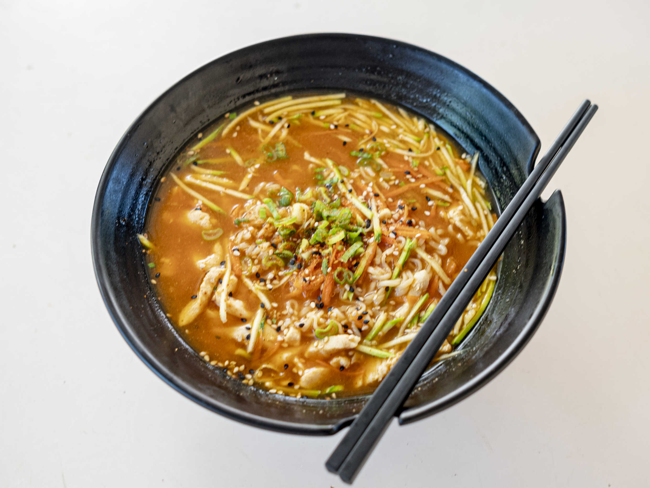 Fideos delgados con verdura rallada (cebolla, zanahoria y calabaza) y un huevo hervido. (Sazonado con salsa y polvo de pescado y soya)