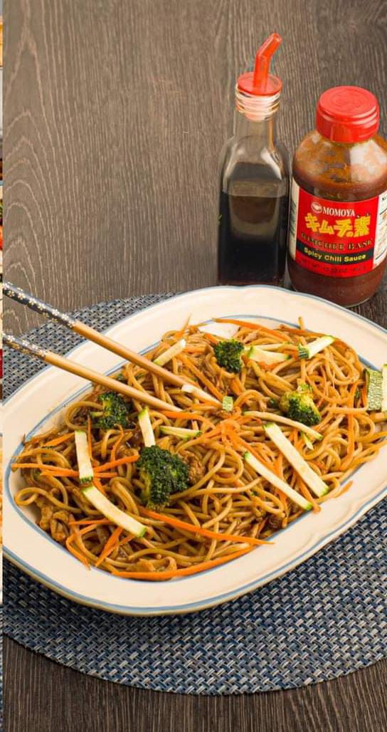 Verduras salteadas con fideos fritos o arroz, con la carne de su preferencia.