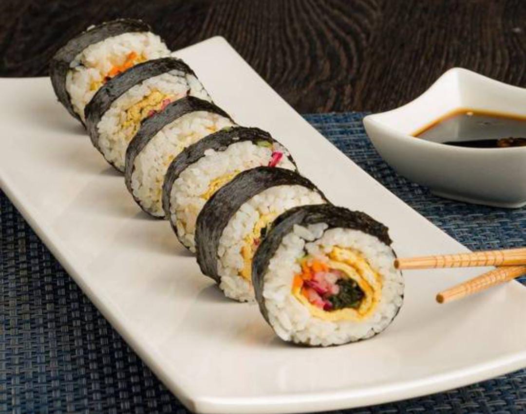 Rollo de 10 piezas con nabo, zanahoria, espinaca, pepino y huevo por dentro, y alga nori por fuera