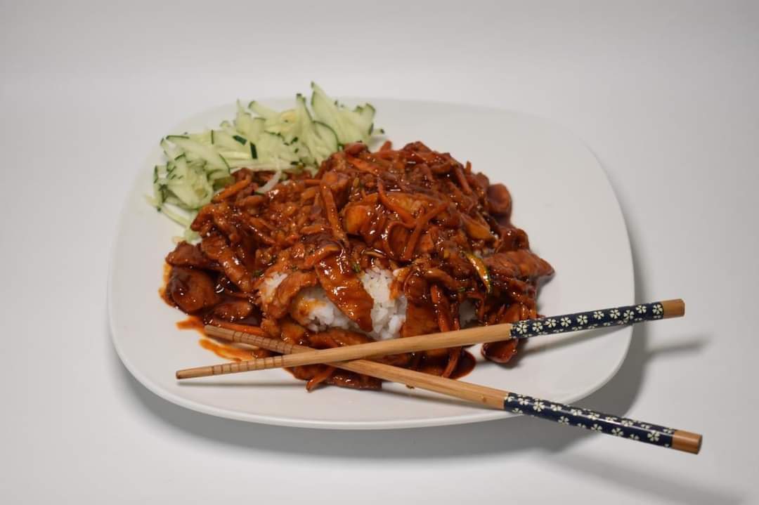 6 piezas de alitas crujientes bañadas con salsa dulce/picante elaborada con pasta de chile (gochujang), mostaza, cátsup y soya.