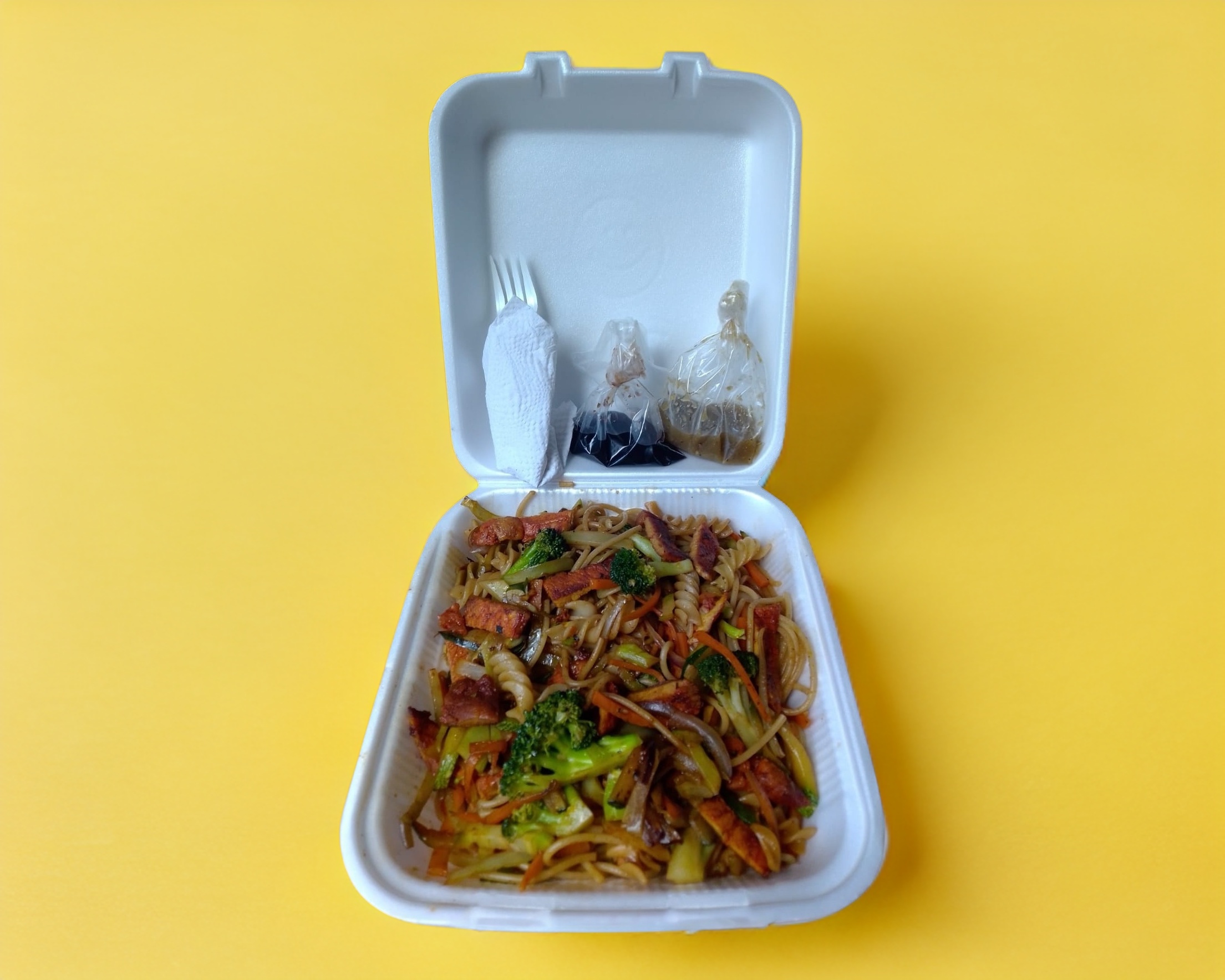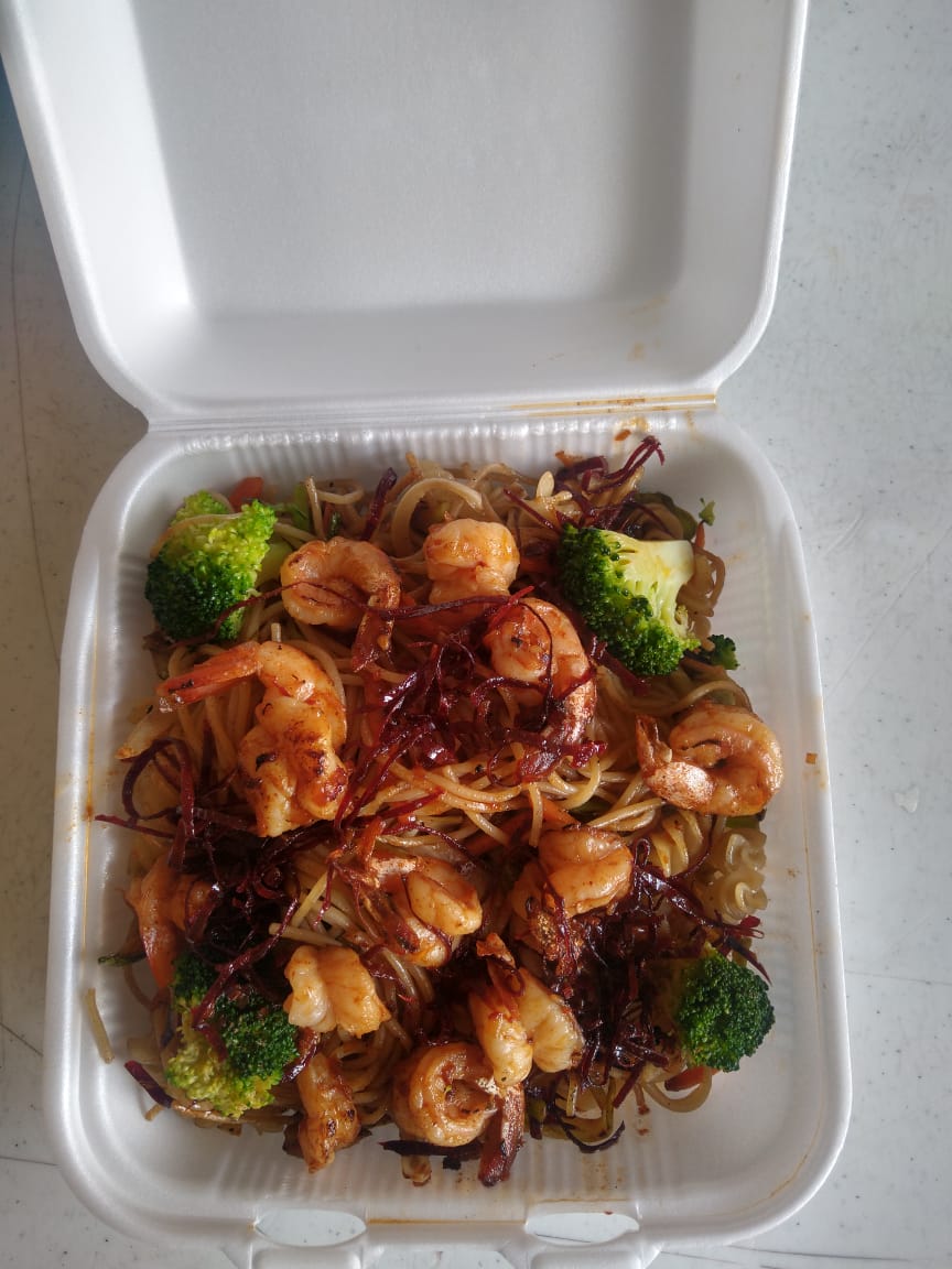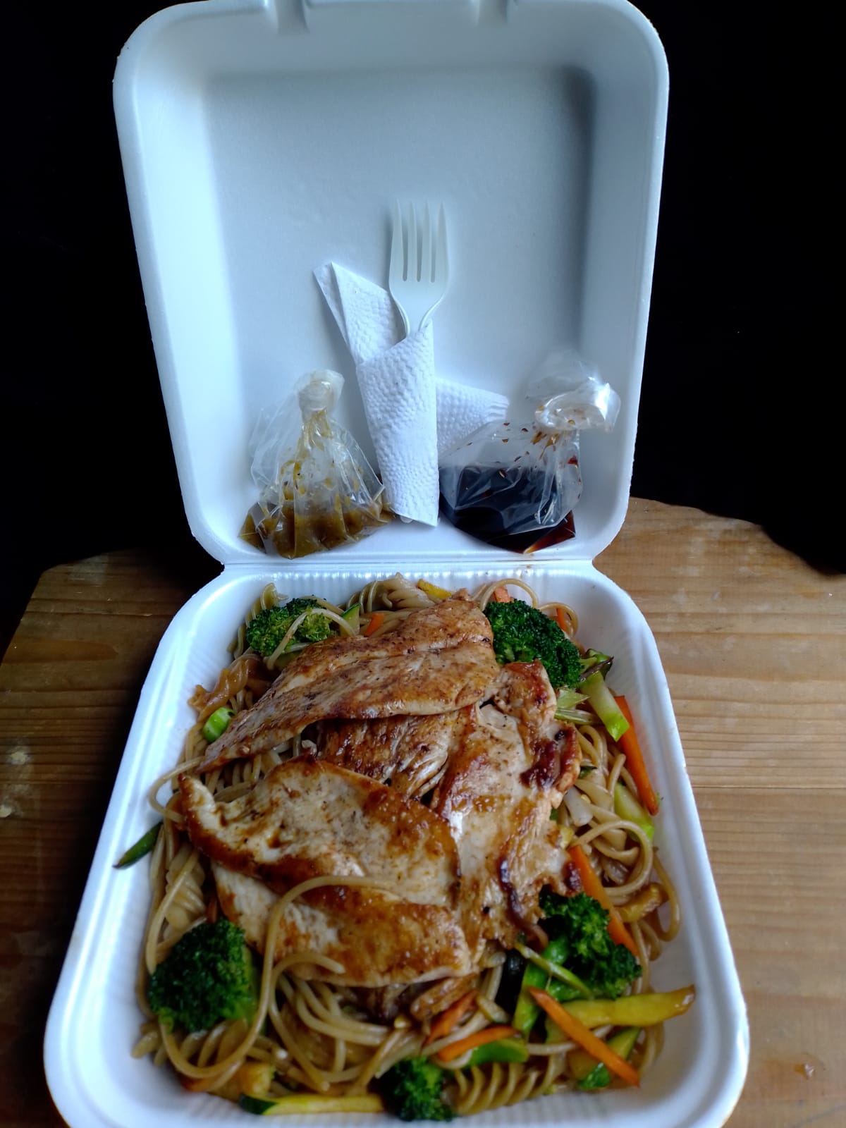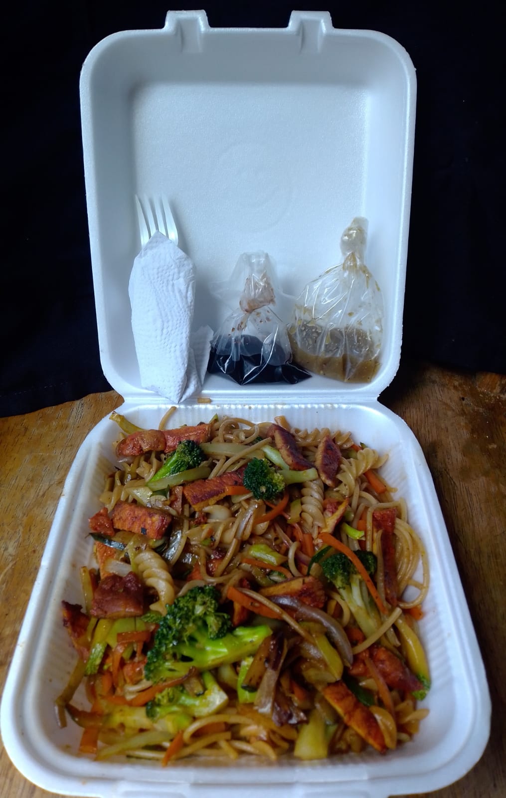 Vegetales (Brócoli, zanahoria, calabaza italiana y cebolla blanca) acompañados de un mix de pasta (Spaghetti y fusilli) y mezclados en salsa soya, con opción en proteína de pollo, cerdo o mixto. Incluye salsa picante y salsa de soya.