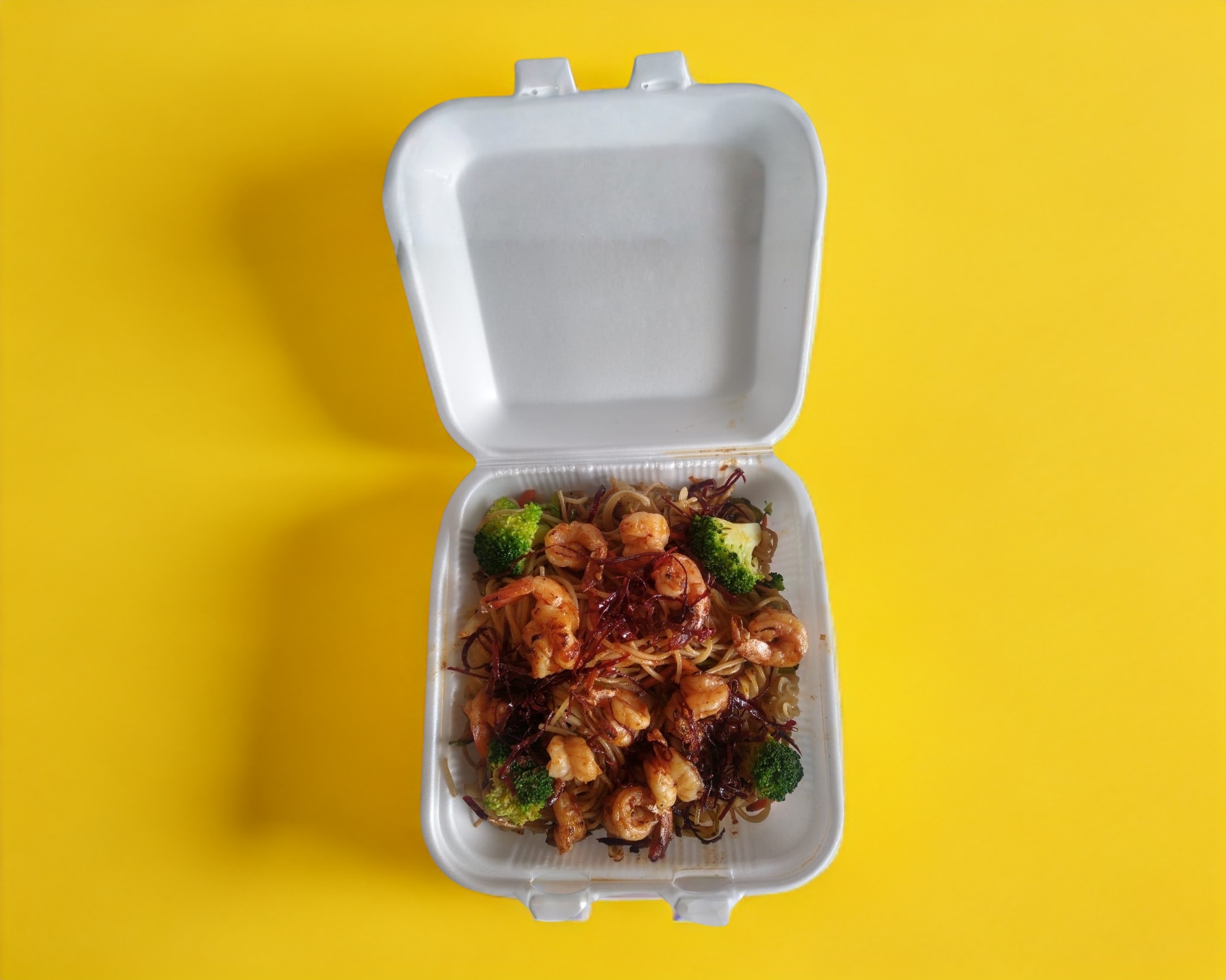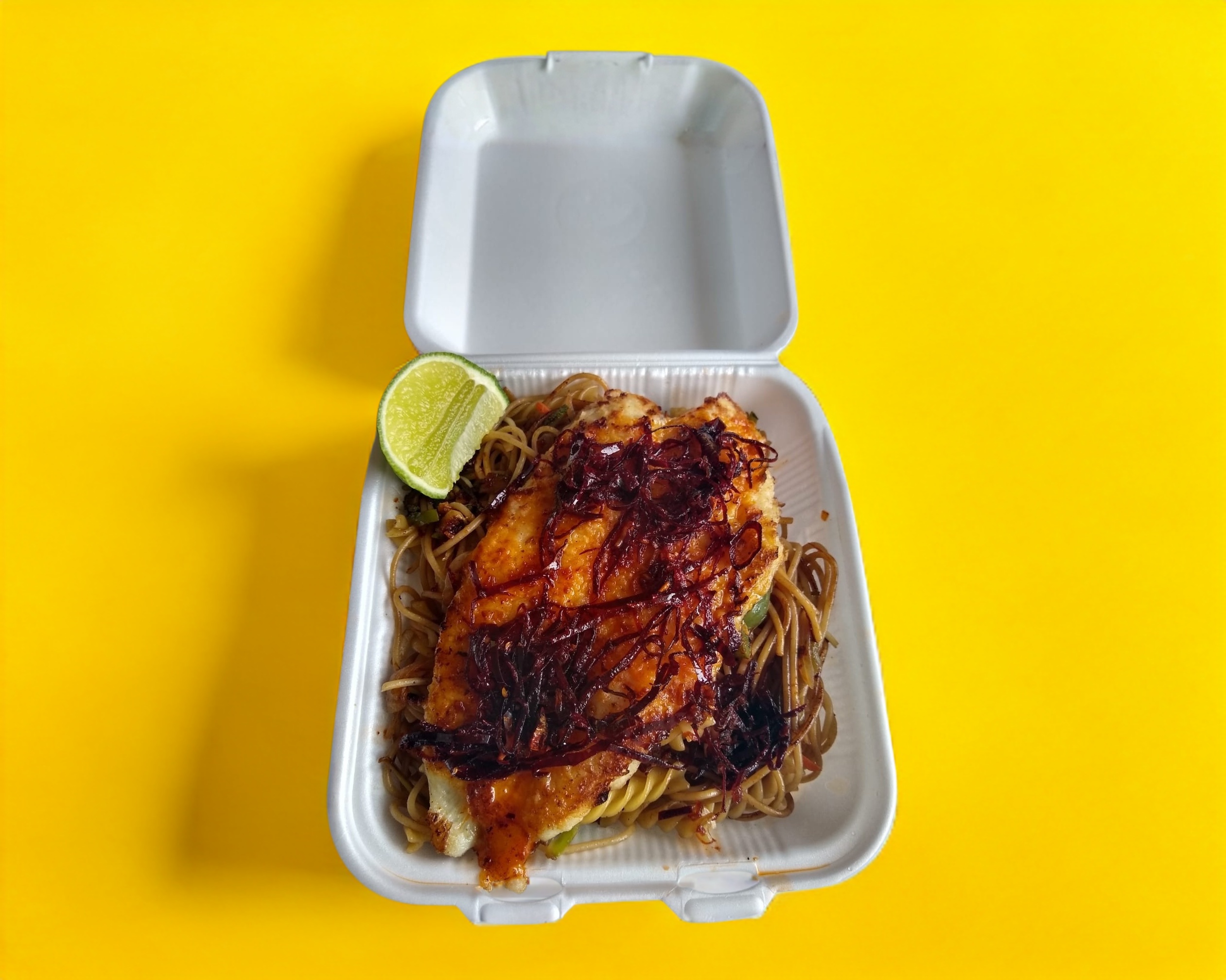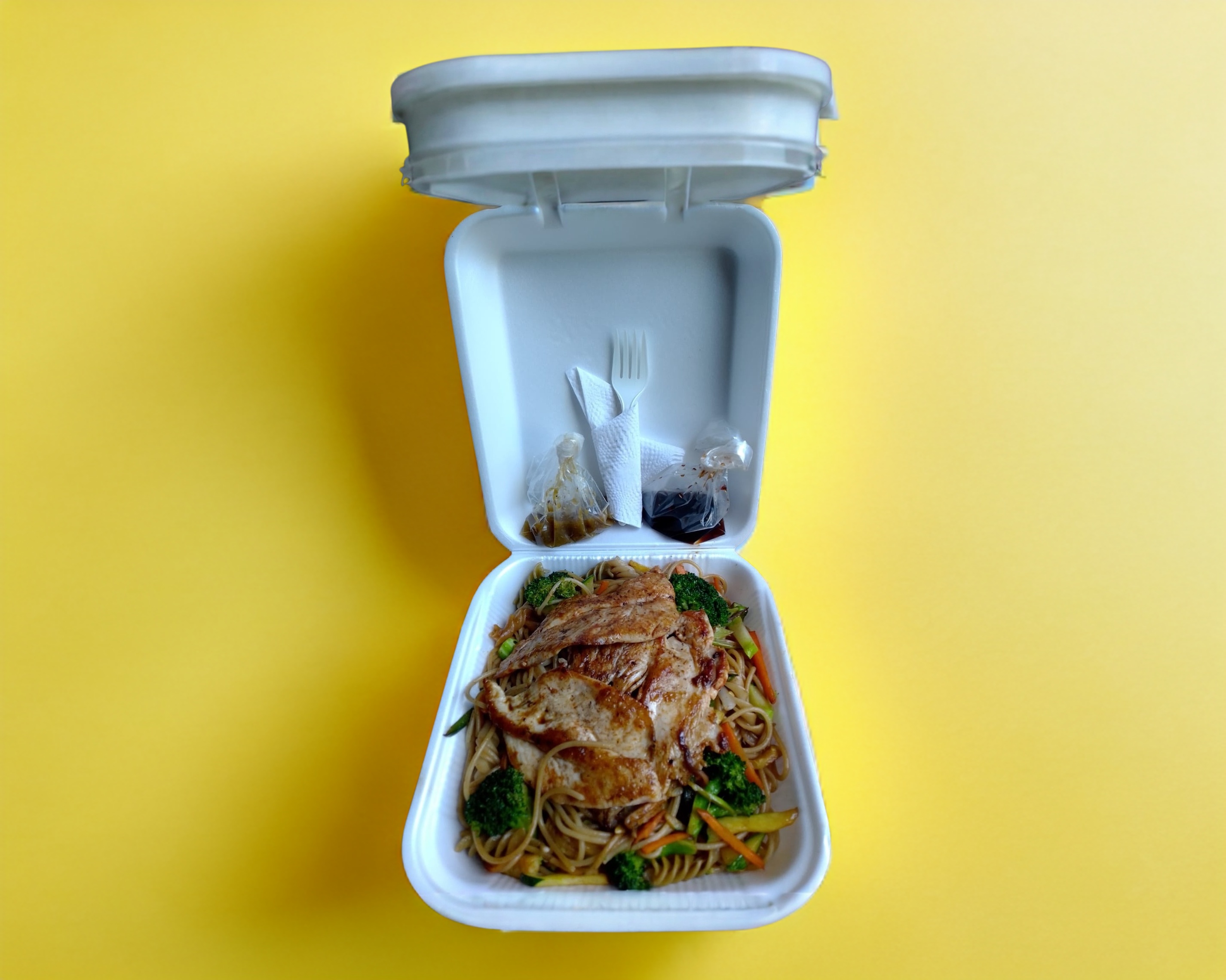 Vegetales (Brócoli, zanahoria, calabaza italiana y cebolla blanca) acompañados de un mix de pasta (Spaghetti y fusilli) y mezclados en salsa soya, con opción en proteína de pollo, cerdo o mixto. Incluye salsa picante y salsa de soya.