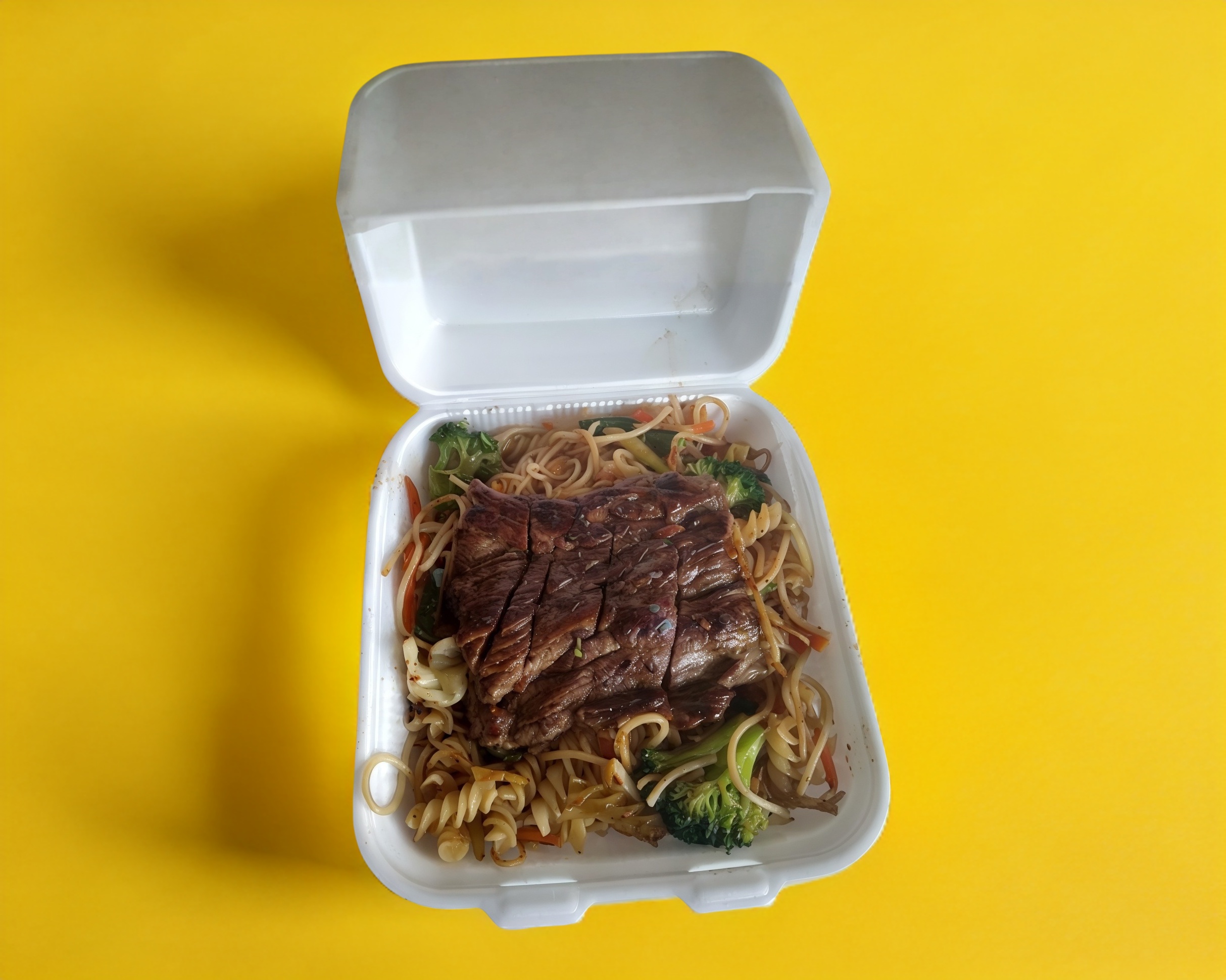 Bistec de cerdo enchilado con mix de pasta (Spaguetti y Fusilli) y vegetales (Brócoli, zanahoria, calabaza italiana, cebolla blanca y col) Incluye salsa picante y salsa de soya.