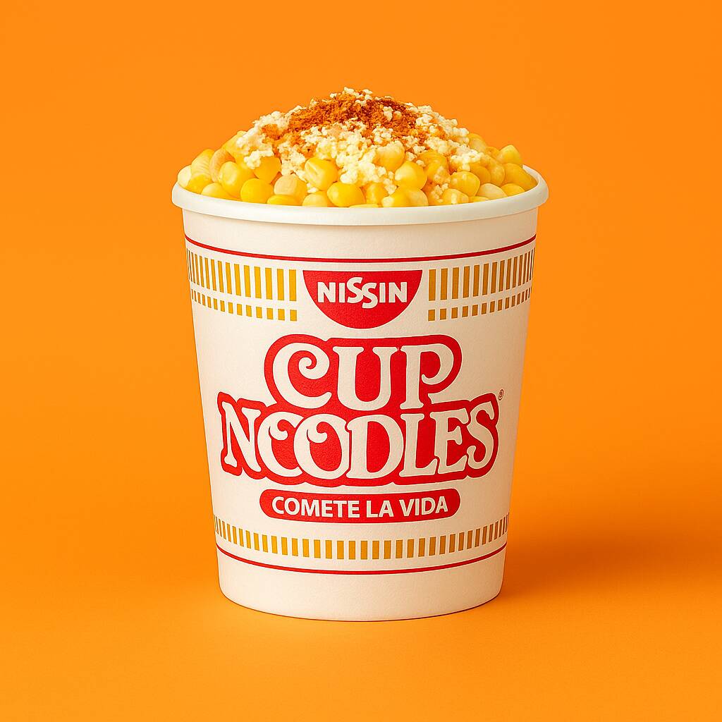 Sopa tipo maruchan servida con esquite, mayonesa, queso cotija