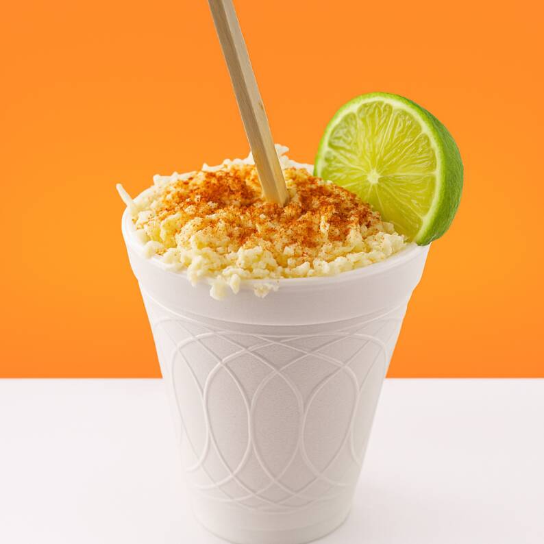 Vaso de esquite tradicionalmente preparado con mayonesa y queso