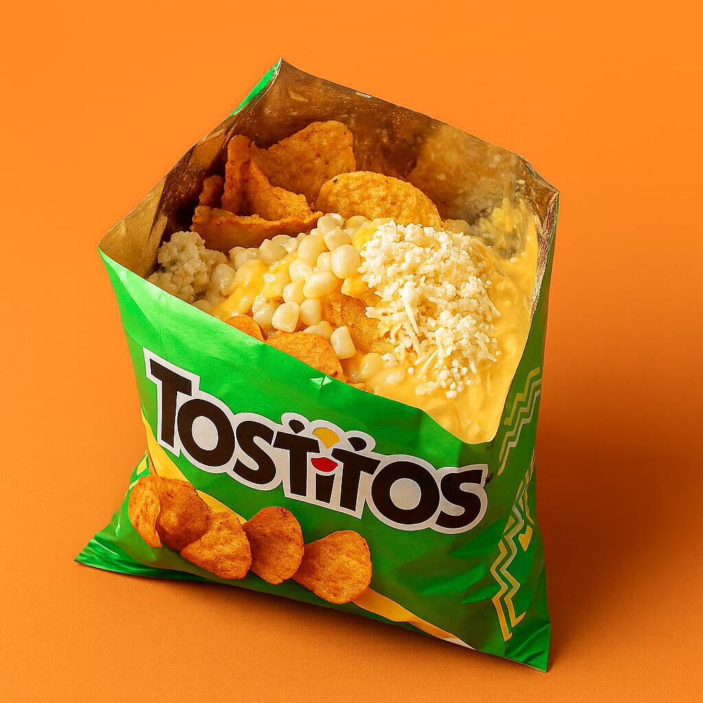 Bolsa de tostitos servida con esquites, queso cotija y mayonesa.