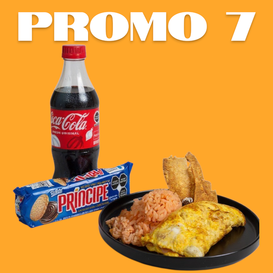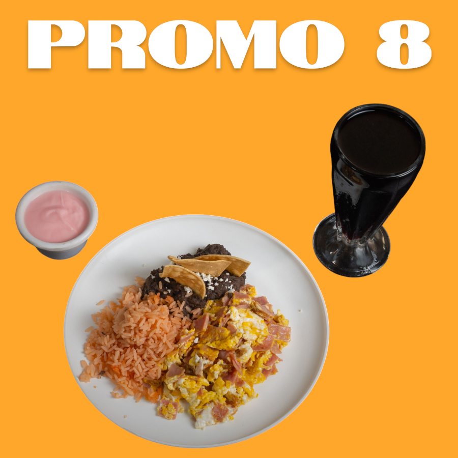 omellet de jamon y queso con arroz y frijoles con una bebida del dia + yogurth4oz o galleta