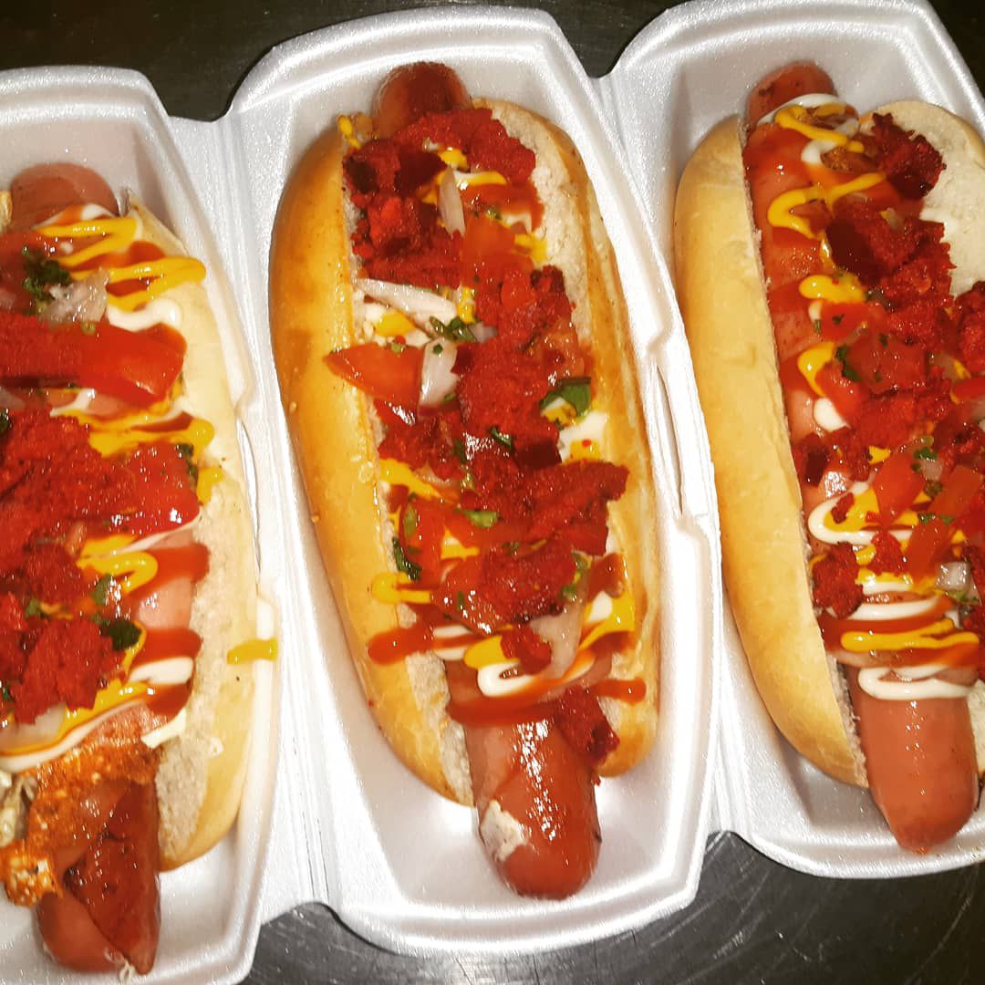 Hot dog de salchicha de pavo, cátsup, mayonesa, mostaza, cebolla, piña, queso americano y tocino.