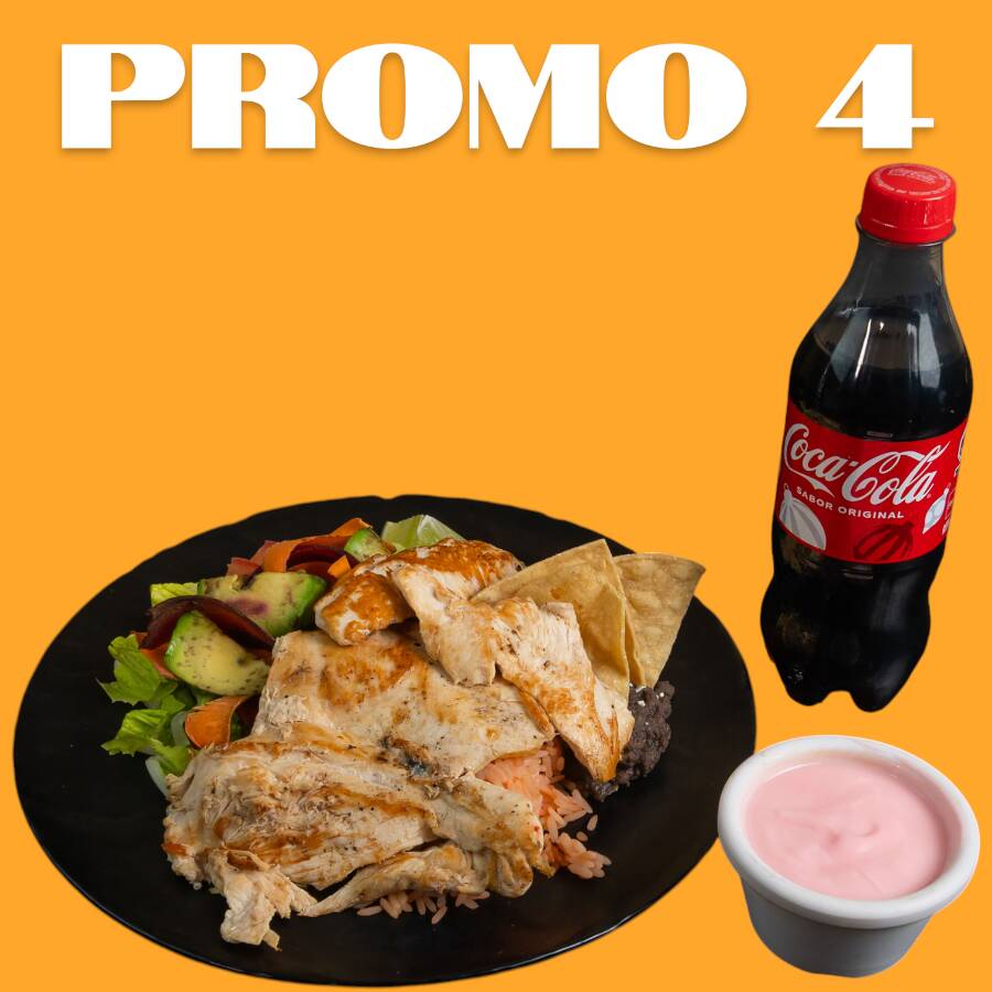 Pechuga de pollo a la plancha, acompañado de tortillas, salsa, ensalada, arroz y frijoles con una bebida del dia + yogurth4oz o galleta