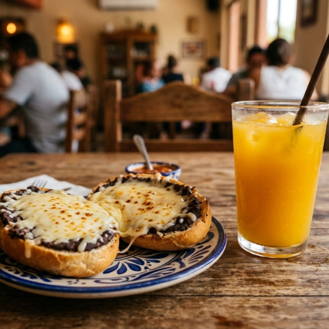 Molletes Naturales, acompañado de arroz y un jugo de naranja de 16oz