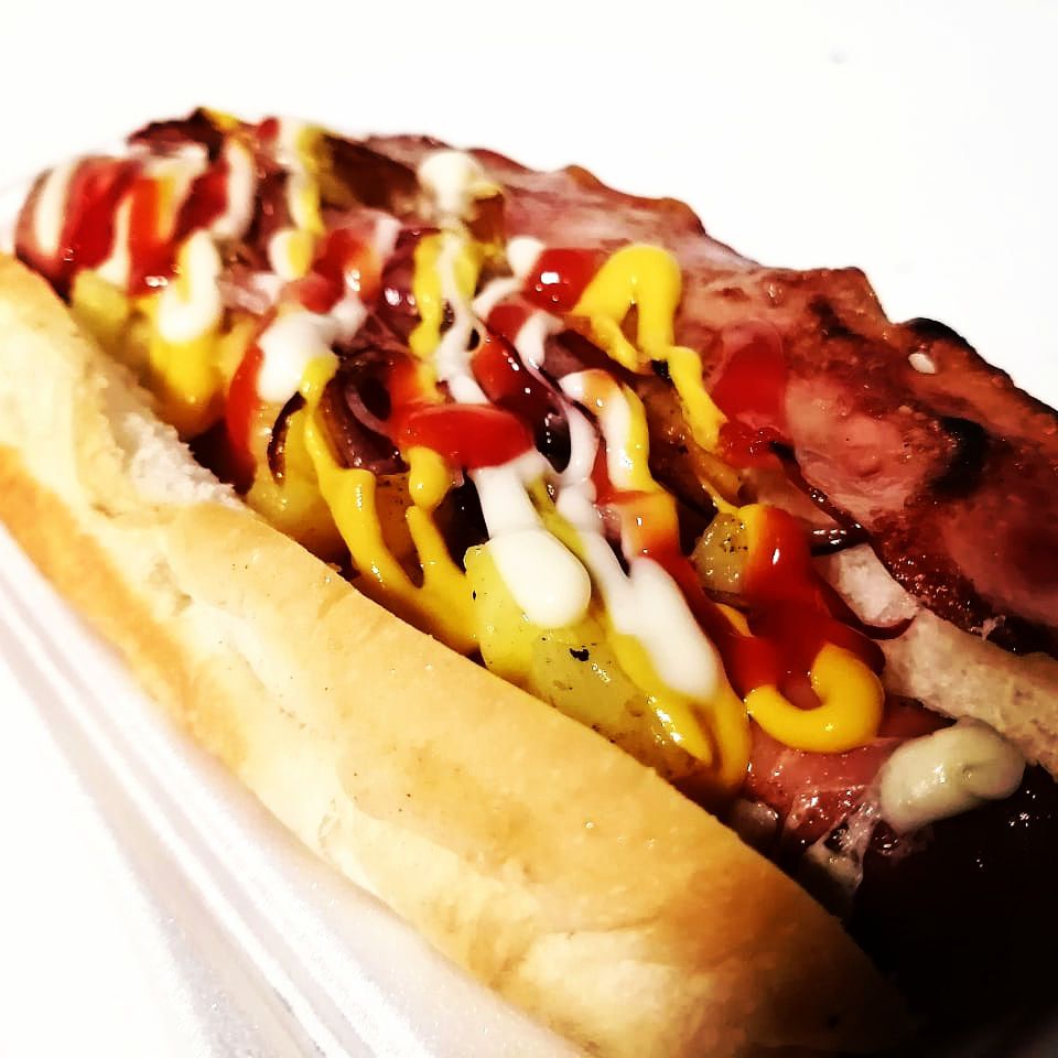 Hot dog de salchicha de pavo, cátsup, mayonesa, mostaza, cebolla y tocino.