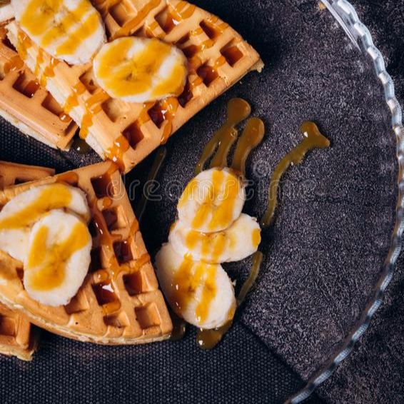2 pzas de wafles con platano y manzana, acompañado de miel maple o miel de abeja.