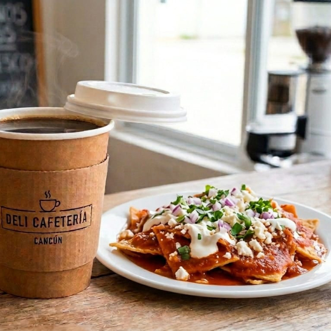 Chilaquiles: Con salsa a elegir, crema, queso, cebolla y cilantro. Hot Cakes (2 pzas): Esponjosos con mermelada. Café Americano (10 oz): Recién colado y caliente.