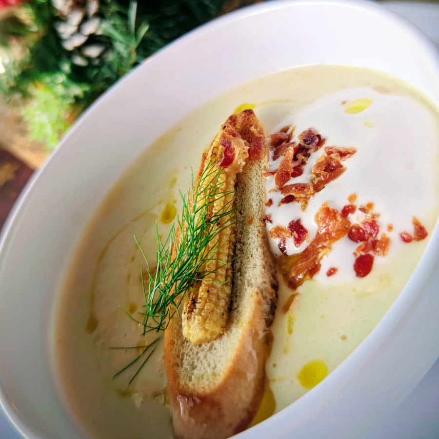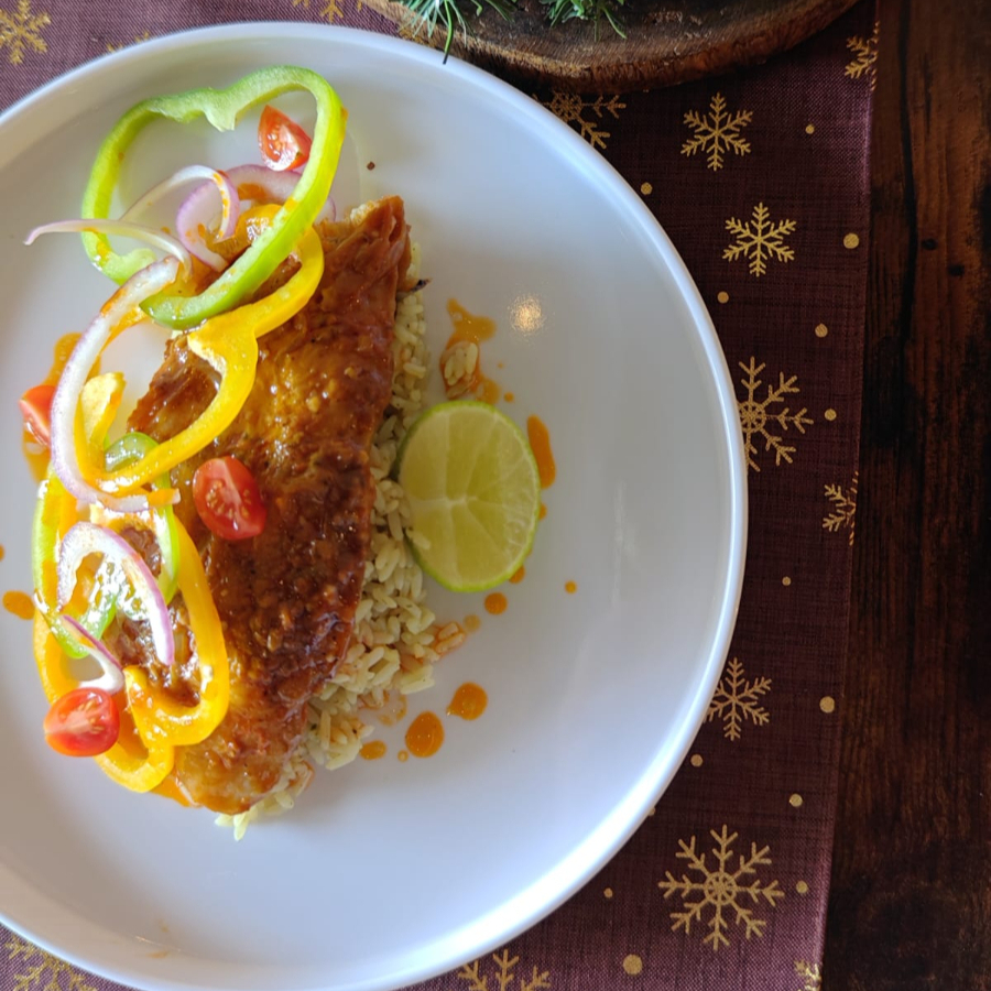 Filete de pescado con pimientos, acompañado de arroz, frijol y crema del dia.