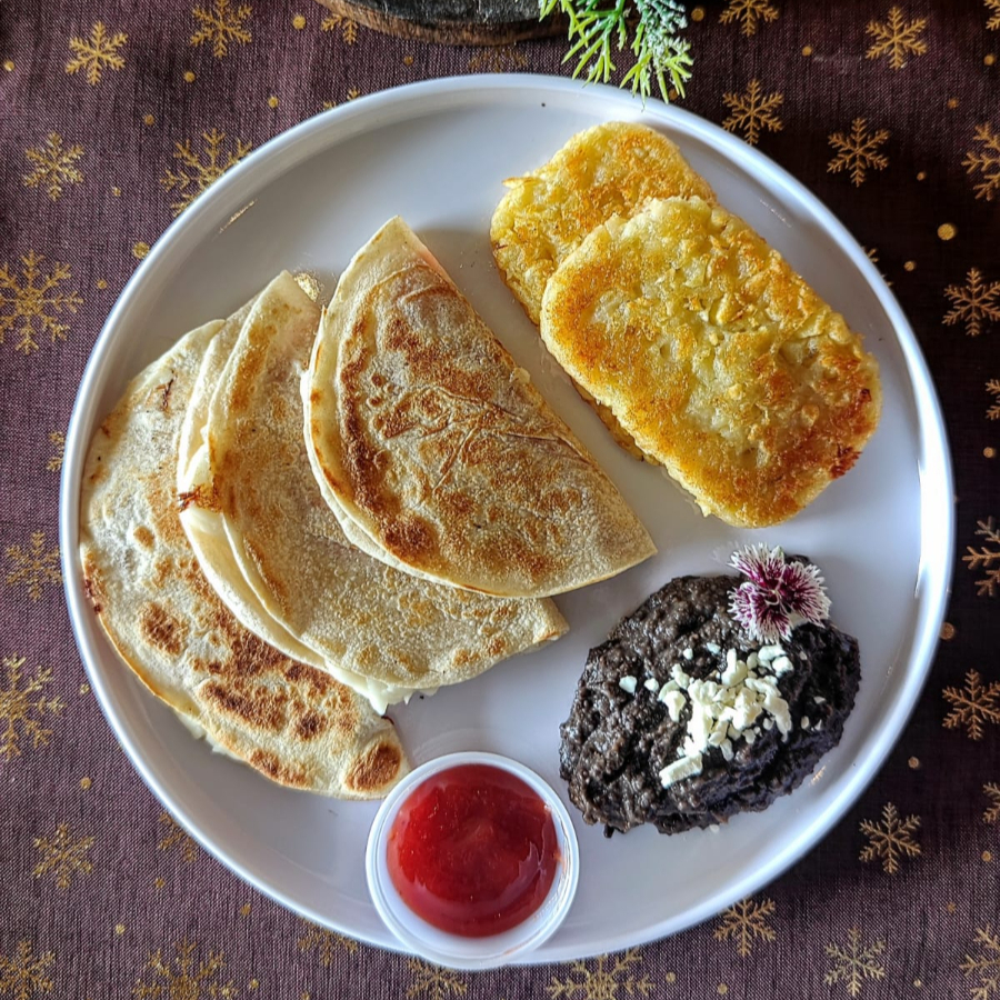 Orden de 3 quesadillas de jamon con queso, acompañado de frijol y papa hash Brown.