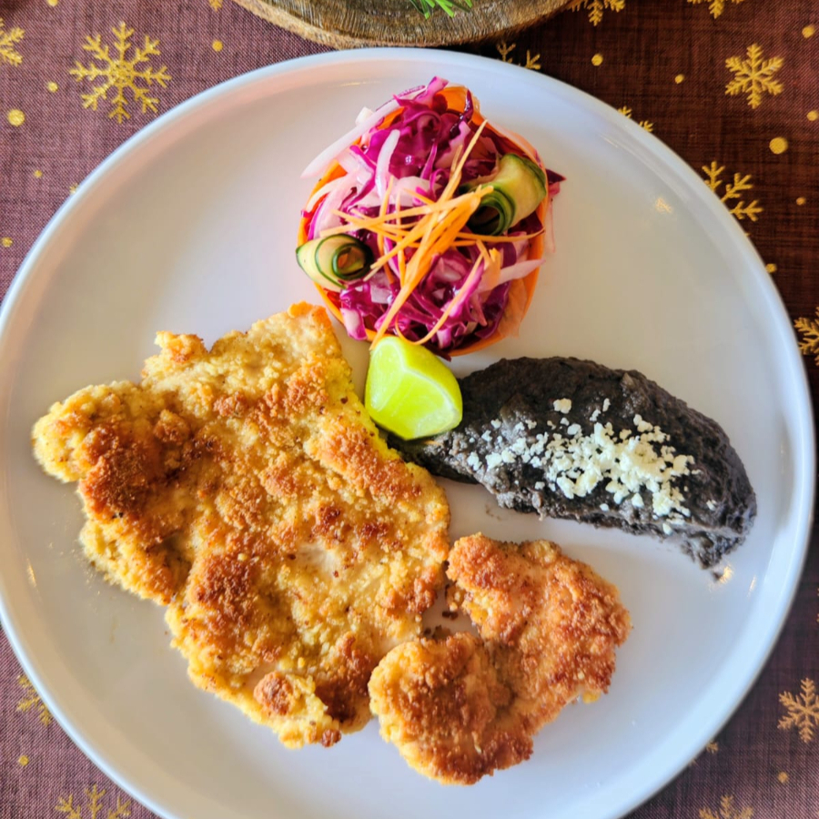 Milanesa de pollo, acompañado de frijol y ensalada.
